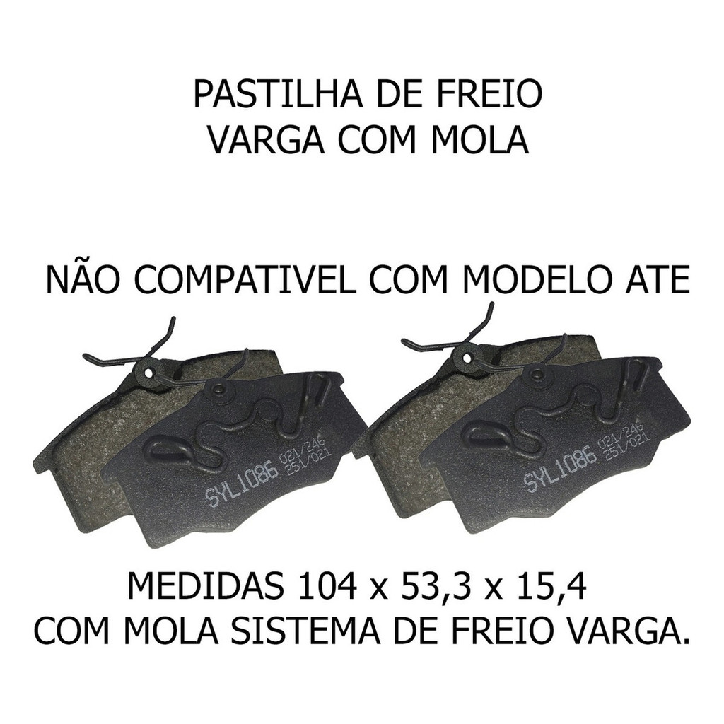 Conteúdo do Anuncio: 01 Jogo Pastilha de Freio Sistema de Freio Varga. OBSERVAÇÃO: VERIFICAR SE O SISTEMA DE FREIO É VARGA COM MOLA POIS OS MESMOS VEICULOS, TAMBÉM APLICAM O SISTEMA TEVES CONFORME AS FOTOS; MEDIDAS 104 x 53,3 x 15,4 COM MOLA SISTEMA DE FREIO VARGA. INFORME O NUMERO DO CHASSIS PARA MELHOR ETENDE-LO ASSIM PODEMOS IDENTIFICAR O MODELO CORRETO. Aplicação: Gol 1996, 1997, 1998, 1999, 2000, 2001, 2002, 2003, 2004, 2005, 2006, 2007 e 2008 Motor 1.0/1.6/1.8/2.0 8/16v SISTEMA DE FREIO VARGA Parati 1995, 1996, 1997, 1998, 1999, 2000, 2001, 2002, 2003, 2004, 2005, 2006, 2007 e 2008 Motor 1,0/1.6/1.8/2.0 8/16v SISTEMA DE FREIO VARGA Saveiro 1997, 1998, 1999, 2000, 2001, 2002, 2003, 2004, 2005, 2006, 2007 e 2008 Motor 1.6/1.8/2.0 8v Sistema de freio Varga.