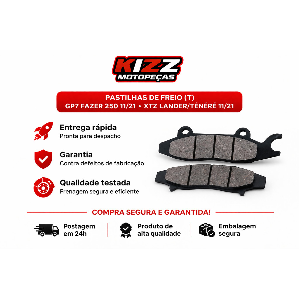 A Pastilha de Freio Traseira (T) GP7 para a Yamaha Fazer 250 (2011 a 2021) é uma peça de reposição fabricada com material orgânico. Este tipo de material proporciona boa eficiência de frenagem e desgaste equilibrado, ideal para uso em motos de média cilindrada. É compatível também com a Lander 250 do mesmo período. Principais características: Material orgânico: Garantia de boa performance e segurança. Compatibilidade: Yamaha Fazer 250 e Lander 250, modelos de 2011 a 2021.Instalação: Segue padrões OEM (equipamento original), o que facilita a substituição sem necessidade de adaptações.