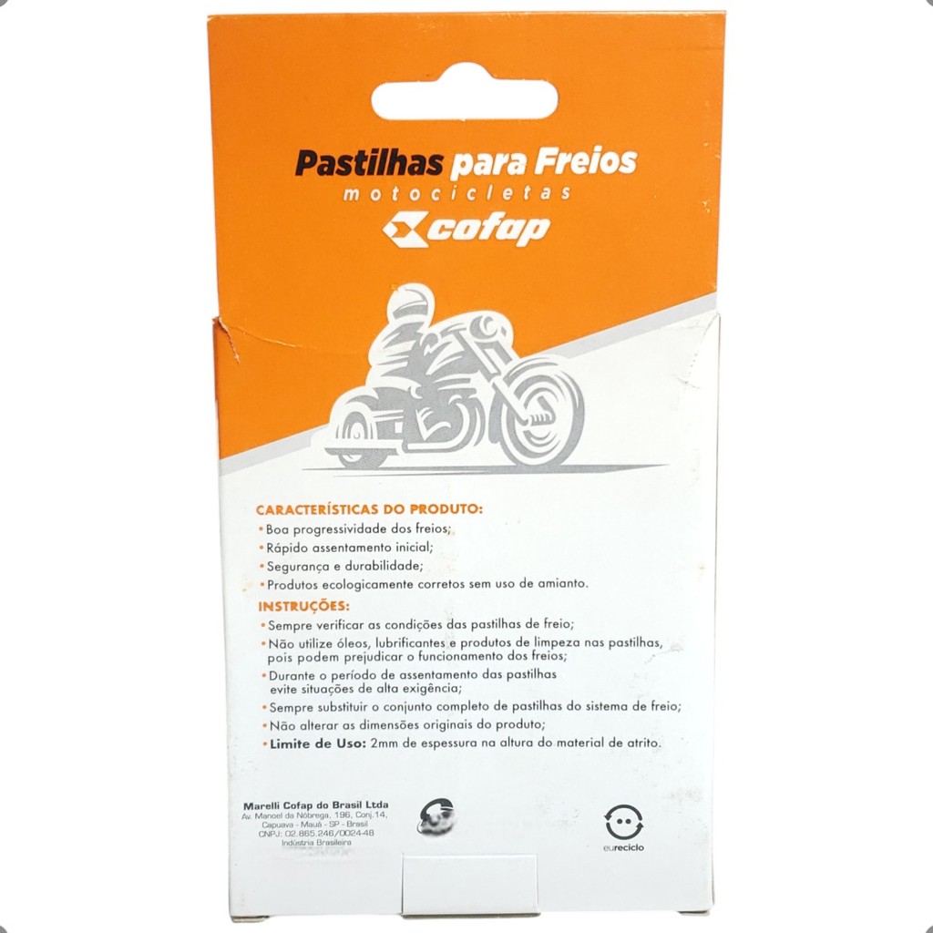 PASTILHA DE FREIO TRASEIRA COFAP - DAFRA NEXT 250 / KYMCO Especificações Técnicas: Marca: Cofap (Original) Produto: Pastilha de Freio Traseira Código Cofap: PFC590003 Tipo: Orgânica Referência OEM: 45105-LB1-73050 Aplicação: Exclusivamente no eixo Traseiro (T) Dimensões: Este kit contém duas pastilhas com tamanhos diferentes. Pastilha 1: 73,00 x 47,00 x 11,00 mm Pastilha 2: 94,00 x 47,00 x 8,50 mm Conteúdo: 1 Jogo de pastilhas para a pinça de freio traseira. PEÇA ORIGINAL COFAP - ENVIO COM NOTA FISCAL E GARANTIA DE 3 MESES ATENÇÃO: JOGO COM 2 PASTILHAS DE TAMANHOS DIFERENTES Este kit de pastilha traseira contém duas peças com medidas distintas. Isso NÃO é um erro, é a característica correta para o design da pinça de freio dos modelos listados abaixo. APLICAÇÃO TRASEIRA (EIXO T) DAFRA Next 250 - 2012 a 2017 Roadwin 250 - 2011 a 2016 KYMCO Agility Maxi 300i ABS – 2015 a 2021 MXU 300 R – 2010 a 2012 MXU 500i – 2009 a 2012 POR QUE ESCOLHER AS PASTILHAS DE FREIO COFAP? Tecnologia e Qualidade Original: Utilize na sua moto a tecnologia e a confiança da Cofap, uma marca líder que é sinônimo de qualidade original. Estas pastilhas garantem uma performance de frenagem segura e consistente, exatamente como o projeto da sua moto exige. Engenharia de Encaixe Perfeito: O design com duas pastilhas de tamanhos diferentes é proposital. Ele assegura o encaixe e o contato perfeitos com a pinça e o disco de freio, otimizando a frenagem, evitando ruídos e garantindo um desgaste uniforme. Durabilidade para Todas as Condições: Fabricadas com um composto orgânico de alta qualidade, as pastilhas Cofap oferecem durabilidade superior e excelente resposta de frenagem, seja no trânsito urbano, em estradas ou no uso off-road dos quadriciclos. Perguntas Frequentes 1. Recebi o produto e as duas pastilhas têm tamanhos diferentes. Está correto? Sim, está 100% correto. Para os modelos listados, o projeto da pinça de freio traseira exige que as pastilhas interna e externa tenham medidas distintas para um funcionamento perfeito. 2. Esta pastilha serve no freio dianteiro? Não. Este modelo PFC590003 é específico para aplicação no freio traseiro das motos e quadriciclos indicados na lista. 3. O valor é referente ao par de pastilhas? Sim. O valor é referente ao jogo completo para a pinça de freio traseira, contendo as duas pastilhas necessárias para a troca. Dúvidas? A equipe da Bonanza Auto Peças está à disposição para qualquer esclarecimento.