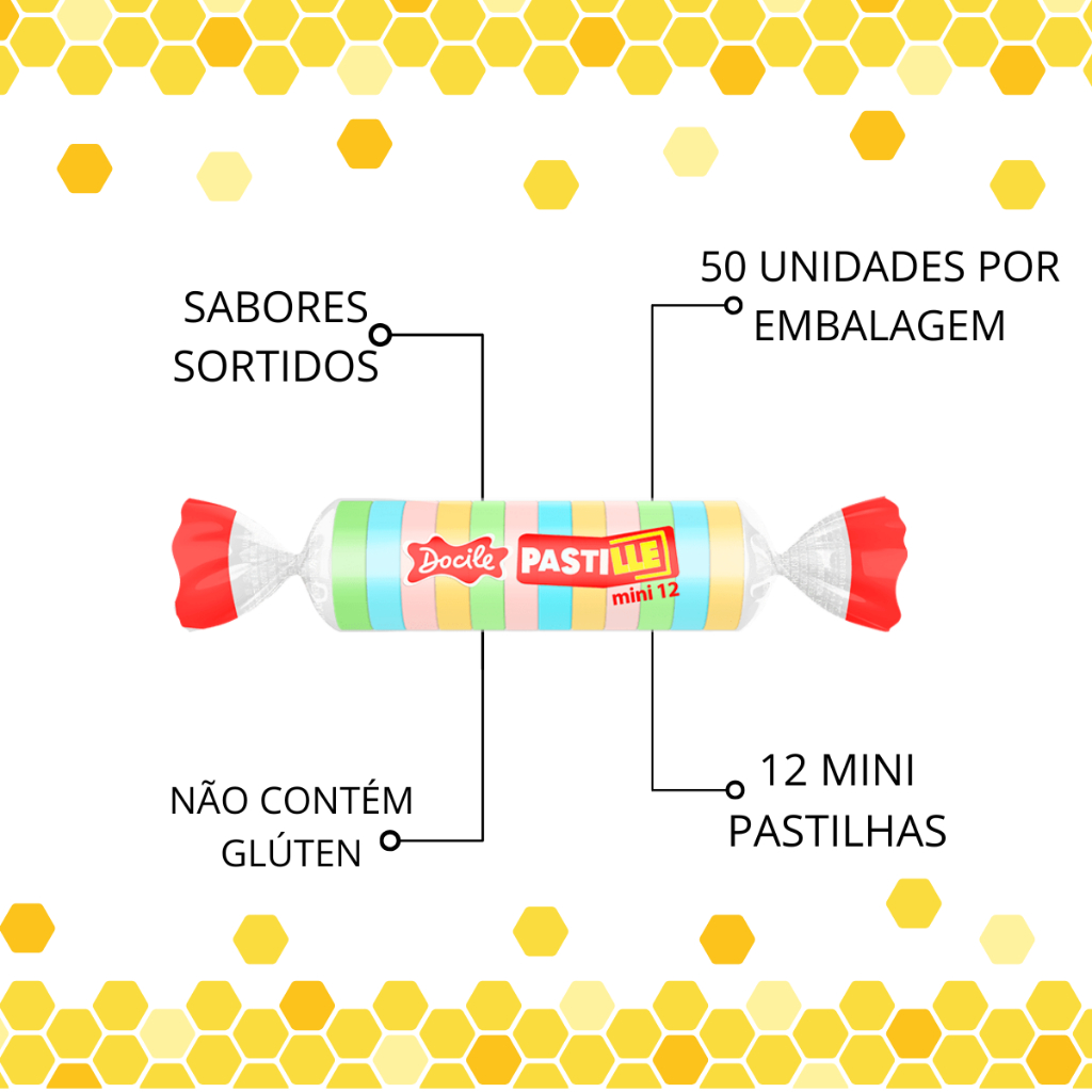Pastille! É assim que se chamam as pastilhas de frutas da Docile! Feitas a partir de um processo de compressão, para que permaneçam firmes e não esfarelem na boca. As embalagens são de sabores sortidos de tutti-frutti, limão, morango, laranja, abacaxi e uva. Cada unidade da Pastille Mini 12 vem com 12 mini pastilhas, e cada uma tem 12mm de diâmetro. Este produto é perfeito para compor decorações de mesas de festas, lembrancinhas e balão surpresa! De pastilha a gente entende!!! A Docile é a maior fabricante da América Latina, e tem pastilha para todos os gostos! Com sabor de frutas, cada pastilha oferece uma explosão de frescor e doçura, tornando-se uma opção irresistível para quem aprecia um doce saboroso. Embora não sejam livres de açúcar, essas balas são uma excelente escolha para quem busca um momento de prazer sem abrir mão do sabor. Ingredientes: Açúcar, gelificante gelatina, antiaglutinantes estearato de magnésio e dióxido de silício, acidulante ácido málico, aromatizantes, corantes artificiais tartrazina, amarelo crepúsculo, vermelho 40 e azul brilhante FCF. NÃO CONTÉM GLÚTEN.