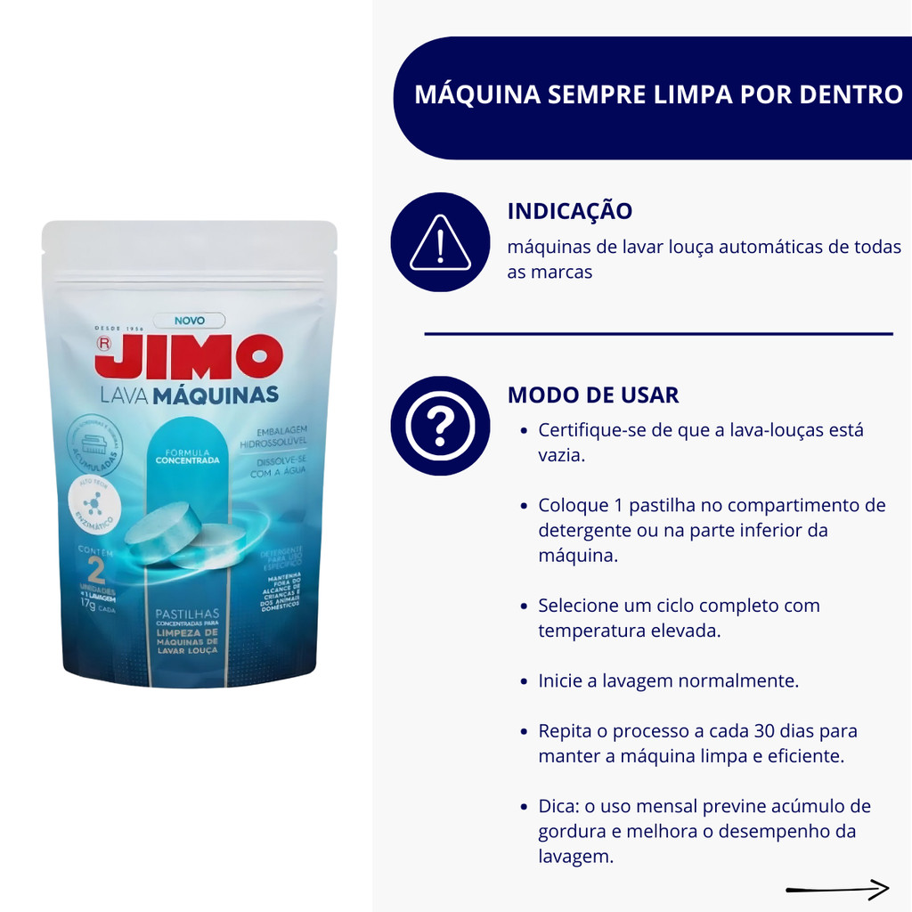 | Pastilhas Jimo Limpa Máquinas Lava-Louças Kit 2 Sachês (4 Unidades) este produto | R$ 30,70 | 13% | 5.0/5 | 26 |