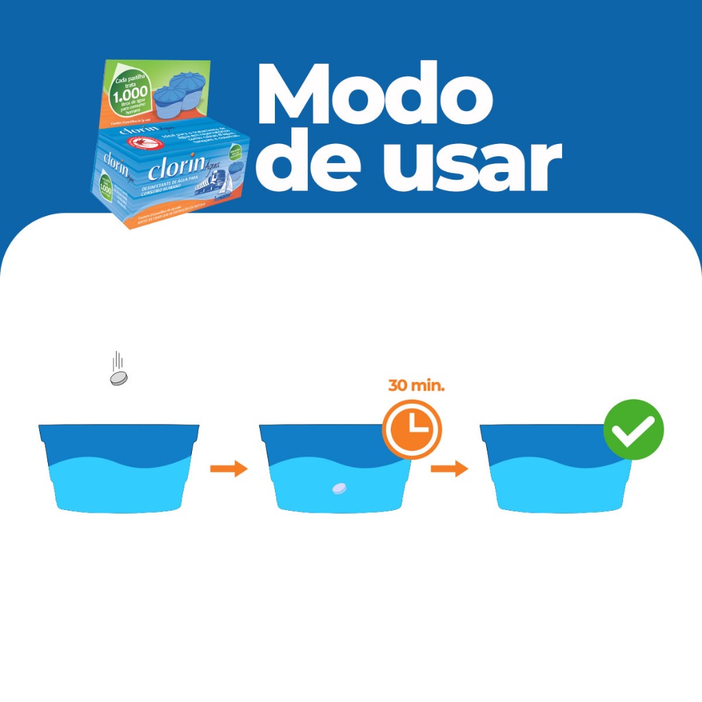 Clorin 1.000 - Pastilhas Purificadoras de Água | Trata até 1.000 Litros Com Clorin 1.000, você garante água tratada com cloro na medida certa para uso em caixas d’água, cisternas, tanques, trailers, chácaras e residências. Ideal para o uso diário — eficaz, prático e econômico! Modo de Usar: 1️⃣ Identifique a capacidade da caixa d’água ou reservatório. 2️⃣ Utilize 1 pastilha para cada 800 a 1.200 litros de água. 3️⃣ Adicione a pastilha diretamente na água e aguarde 30 minutos antes de consumir. 💡 Dica: Sempre que completar o nível da caixa (ou a cada 5 dias), adicione novas pastilhas conforme o volume de água adicionado. Benefícios: ✅ Trata água de qualquer fonte ✅ Elimina bactérias e micro-organismos nocivos ✅ Repele o mosquito da Dengue, Zika e Chikungunya ✅ Não altera o sabor, cor ou odor da água ✅ Mantém o pH estável ✅ Baixo custo por litro tratado ✅ Cloro ativo liberado gradualmente ✅ Pastilhas pré-dosadas — sem precisar medir ✅ Fácil de usar, transportar e armazenar Especificações: • Contém: 25 pastilhas de 2g • Validade: 3 anos a partir da fabricação • Peso da pastilha: 2g • Validade: 3 anos • Registro M.S.: 3.1243.0001 Indicado para: ✅ Caixas d’água residenciais ✅Cisternas e reservatórios ✅Chácaras, sítios, trailers e motorhomes ✅Água para consumo humano ou limpeza doméstica Dúvidas Frequentes: ➡️ Como usar o Clorin 1.000? Adicione a pastilha à água e aguarde 30 minutos antes do consumo. ➡️ Posso usar em qualquer tipo de água? Sim! Clorin 1.000 é eficaz em diferentes fontes de água. ➡️ Muda o sabor da água? Não. A água tratada mantém sabor, cor e odor naturais. ➡️ Serve para reservatórios grandes? Para volumes maiores, confira também o Clorin 500 e o Clorin 10.000. Pode ser utilizado em reservatórios de grande porte? R: Confira versões adequadas para diferentes volumes - Clorin 500 e Clorin 10.000.