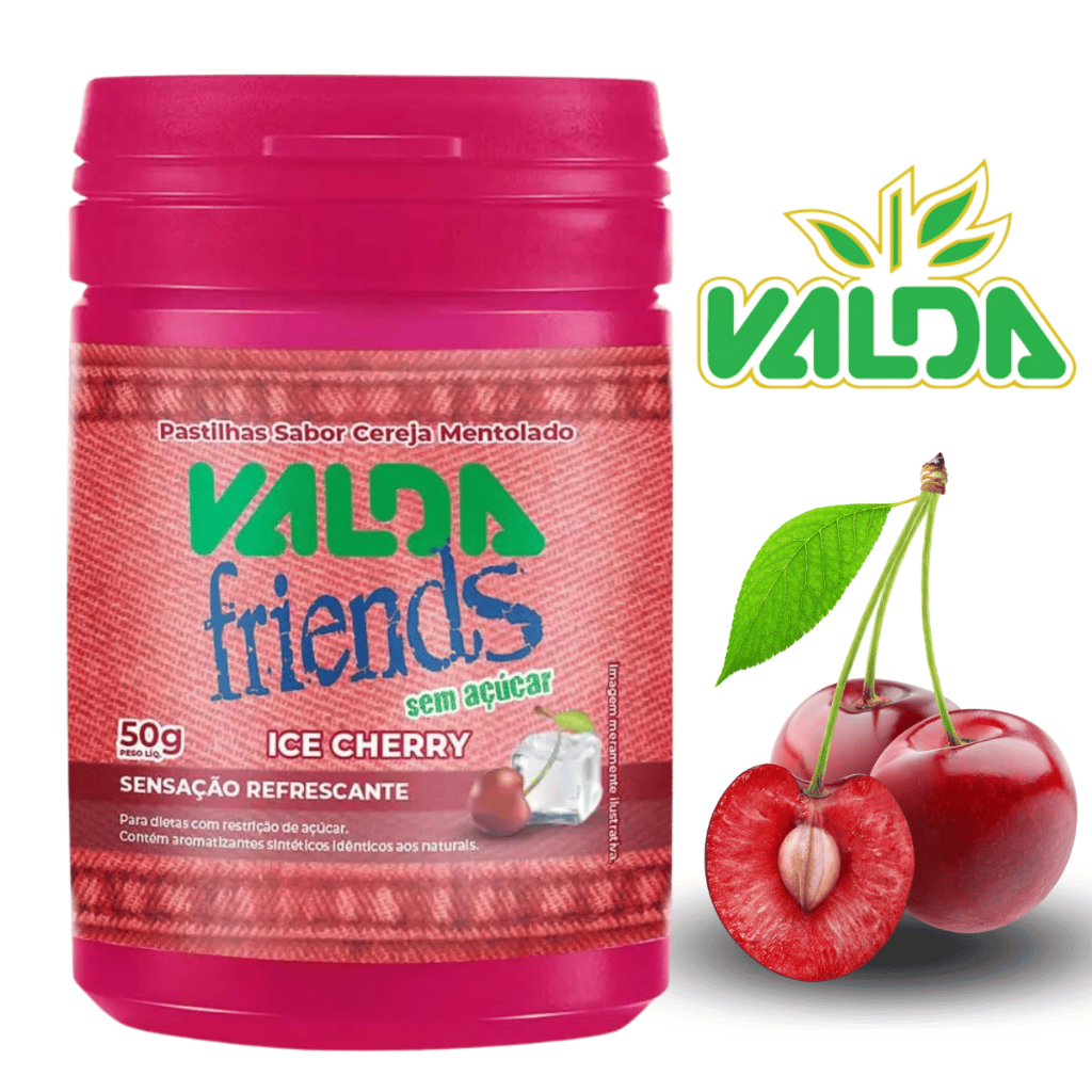 Pastilhas Valda Friends - KIT COM 3 POTES DE 50G CADA A Valda Friends sabor Cereja Ice Cherry é uma pastilha altamente refrescante por possuir uma ação de extensão do frescor. E ainda é zero açúcar! Esse lançamento são pequenas maravilhas que encantam quem prova pela primeira vez. Depois disso, é impossível resistir até a próxima pastilha e, em seguida, repetir a experiência até acabar o pote inteiro! Valda Friends é uma solução saudável, saborosa e muito prática em forma de pastilhas. Ingredientes: Edulcorante natural sorbitol, aromatizantes, anti-aglutinante estearato de magnésio, edulcorante artificial sucralose e corante artificial. Benefícios: · Ação prolongada de refrescância e sabor. · Auxilia no alívio da garganta irritada. · Zero açúcar; · Vegano; · Não contém glúten. NÃO CONTÉM GLÚTEN. *% Valores Diários de Referência com base em uma dieta de 2.000 kcal ou 8.400 kJ. Seus valores diários podem ser maiores ou menores dependendo de suas necessidades energéticas. Produto elaborado com ingredientes naturais, qualquer alteração em sua cor não compromete a qualidade do produto final. Conservar em local seco, fresco e ao abrigo da luz solar. Após aberto, consumir preferencialmente em até 10 dias. VANTAGENS DE COMPRAR COM O MAGAZINE MOZART: 1 - Atendimento VIP, Pessoal e Personalizado. 2 - Clientes atendidos e satisfeitos (consulte avaliações da loja). 3 - Produtos com GARANTIA de qualidade e procedência. 4 - Trabalhamos para uma experiência de compra 5 estrelas. 5 - Pagamento por PIX, Cartão de Crédito, Boleto e SParcelado. Nosso atendimento é de segunda à sexta em horário comercial. Temos todos os produtos à pronta entrega com Envio imediato. Entregamos para todo o Brasil. Aproveite e compre outros produtos da loja para aproveitar o frete, clique em "adicionar ao carrinho", faça isso em todos os nossos produtos que você desejar e depois é só finalizar. IMPORTANTE: Por favor, verifique cuidadosamente o seu endereço de entrega e CEP (o sistema não aceita CEP geral da cidade quando a rua já tem o CEP próprio) para evitar transtornos com o recebimento de seu pedido. Ficou com alguma dúvida? Basta nos chamar pelo chat.