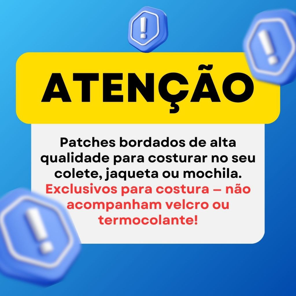 *Patch bordado para costurar no seu colete, jaqueta ou mochila. *Exclusivos para costura — "não acompanham velcro ou termocolante!" * Medidas: 8,5cm x 5cm. * Estilo Artesanal: Cada patches é habilmente bordado, resultando em detalhes visuais impressionantes que se destacam. * Material Duradouro: Criado com materiais premium, os patches mantêm sua integridade mesmo após longos períodos de uso. * Personalização Única: A textura do bordado oferece um toque artesanal, sendo uma tela perfeita para sua criatividade e personalização. * Versatilidade Elegante: Aplique-o em jaquetas, mochilas, bonés, roupas táticas e muito mais para um toque sofisticado. Cuidados Especiais: Para manter a integridade dos Patches, evite lavar em máquina e não utilize produtos químicos abrasivos durante a limpeza. Prazo de Envio: Produtos a pronta entrega envio imediato! Enviamos as compras efetuadas até 15:00h no mesmo dia, e para as compras efetuadas após as 15:00h enviamos no dia útil seguinte.