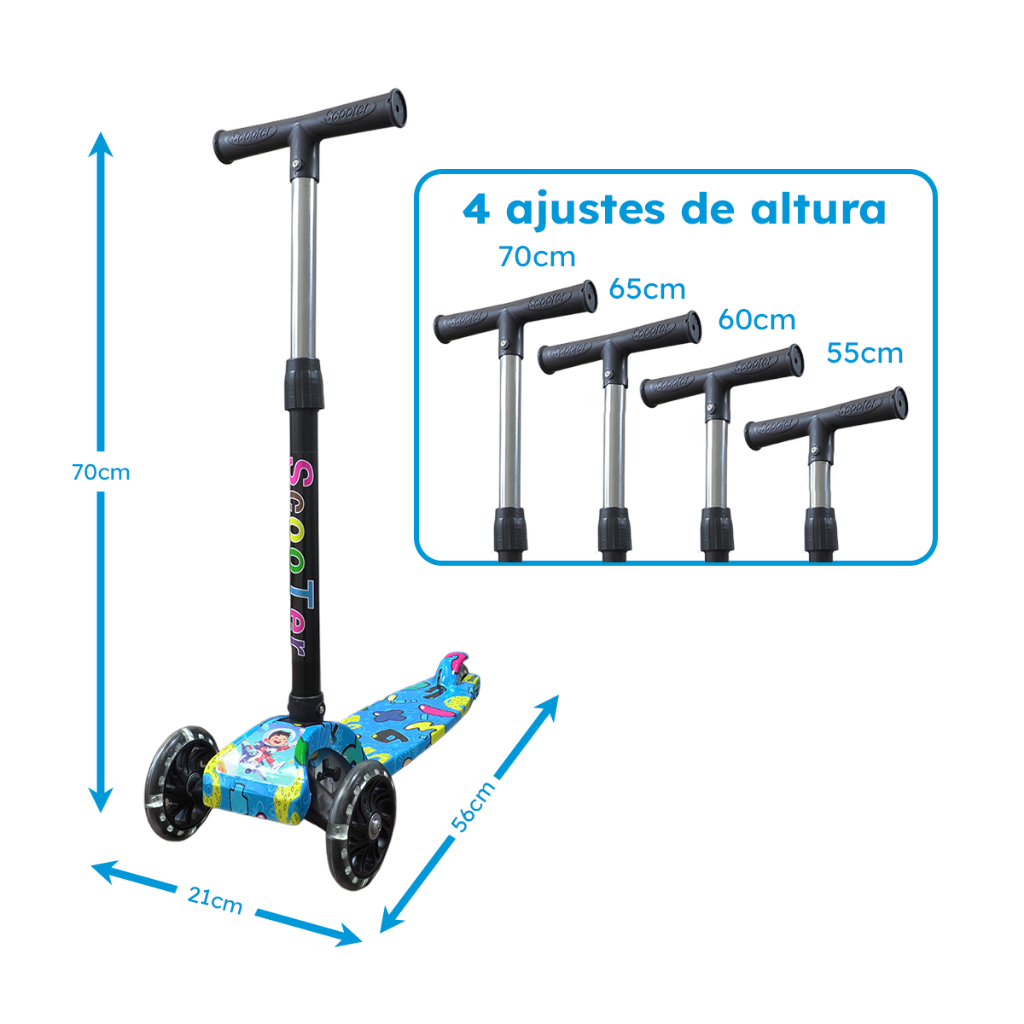 Patinete Azul Rodas LED Colorido Até 25kg | A partir de 3 Anos | Ajuste 4 Alturas | Dobrável | Cert Inmetro | QUEEN SHOP
