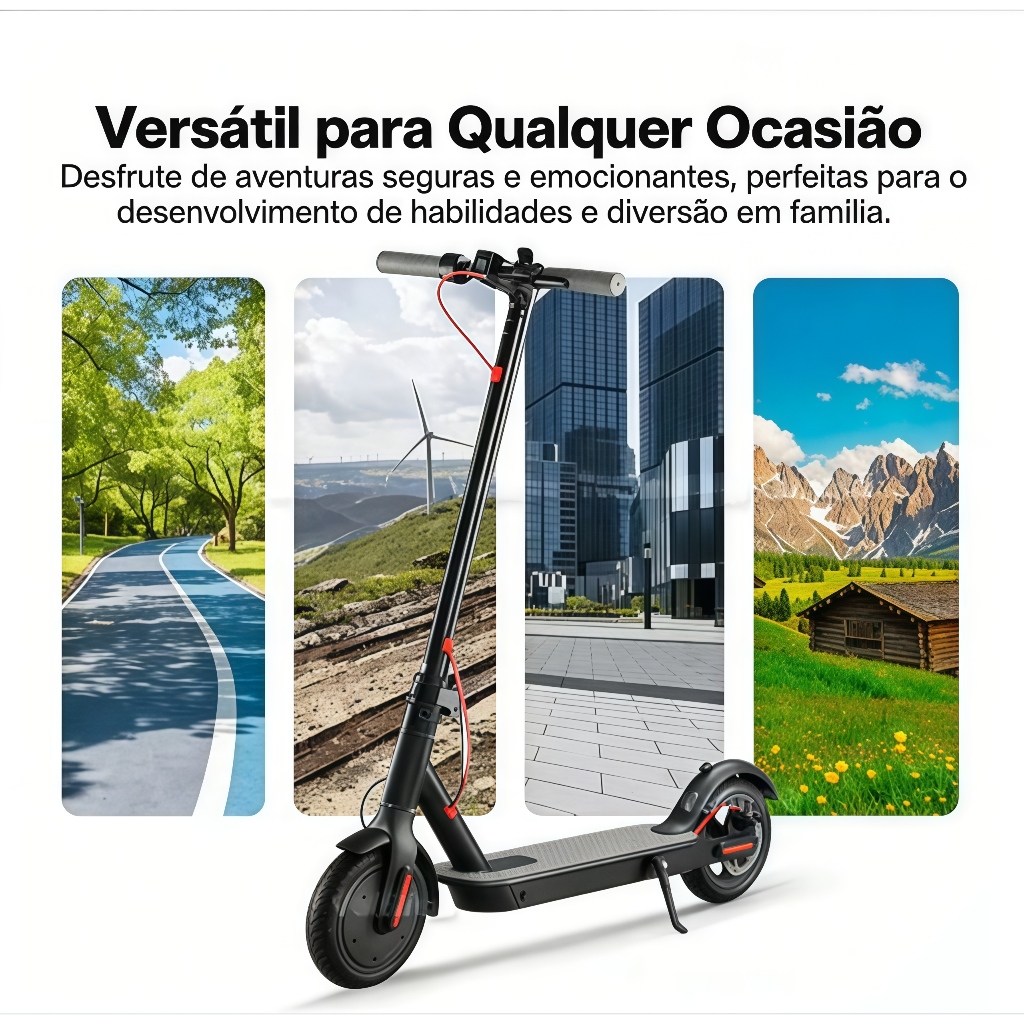 🔧 Novo Sistema de Dobragem Basta girar, pressionar e travar para dobrar. A estrutura reforçada é mais estável e durável, podendo ser guardada facilmente no porta-malas para facilitar seu dia a dia. ⭐ Dobra ultrarrápida em 3 segundos Mais praticidade e muito mais fácil de transportar. 🛞 Pneus de Borracha Natural Automotiva Produzidos com borracha natural de nível automotivo, não furam e possuem design antiderrapante com sulcos de drenagem. A nova tecnologia de suporte interno e o processo especial de alívio estrutural garantem: Maior elasticidade Menor risco de explosão Zero manutenção Alto amortecimento Um pneu três em um para uma experiência de condução muito mais confortável. 🐝 Pneu Tipo Favo com Múltiplos Orifícios Atualizado para 8,5 polegadas. 🛑 Sistema de Freio Melhorado O freio perfurado em aço alto carbono oferece resposta rápida, distância de frenagem menor e parada imediata, aumentando a segurança. 🔩 Disco de Freio Perfurado • Aço Alto Carbono 🌀 Amortecimento Multifuros 🏆 Alta Elasticidade e Alto Amortecimento Ficha Técnica – Patinete Elétrico COM AMORTECEDOR 🔌 Potência do Motor: 350W 🔋 Bateria: 48V 12Ah ⚡ Velocidade Máxima: ~30 km/h 📍 Autonomia por Carga: Aproximadamente 30 km (dependendo do peso e terreno) 🛞 Pneus: 14 polegadas 🏋️ Capacidade de Carga: Até 150 kg