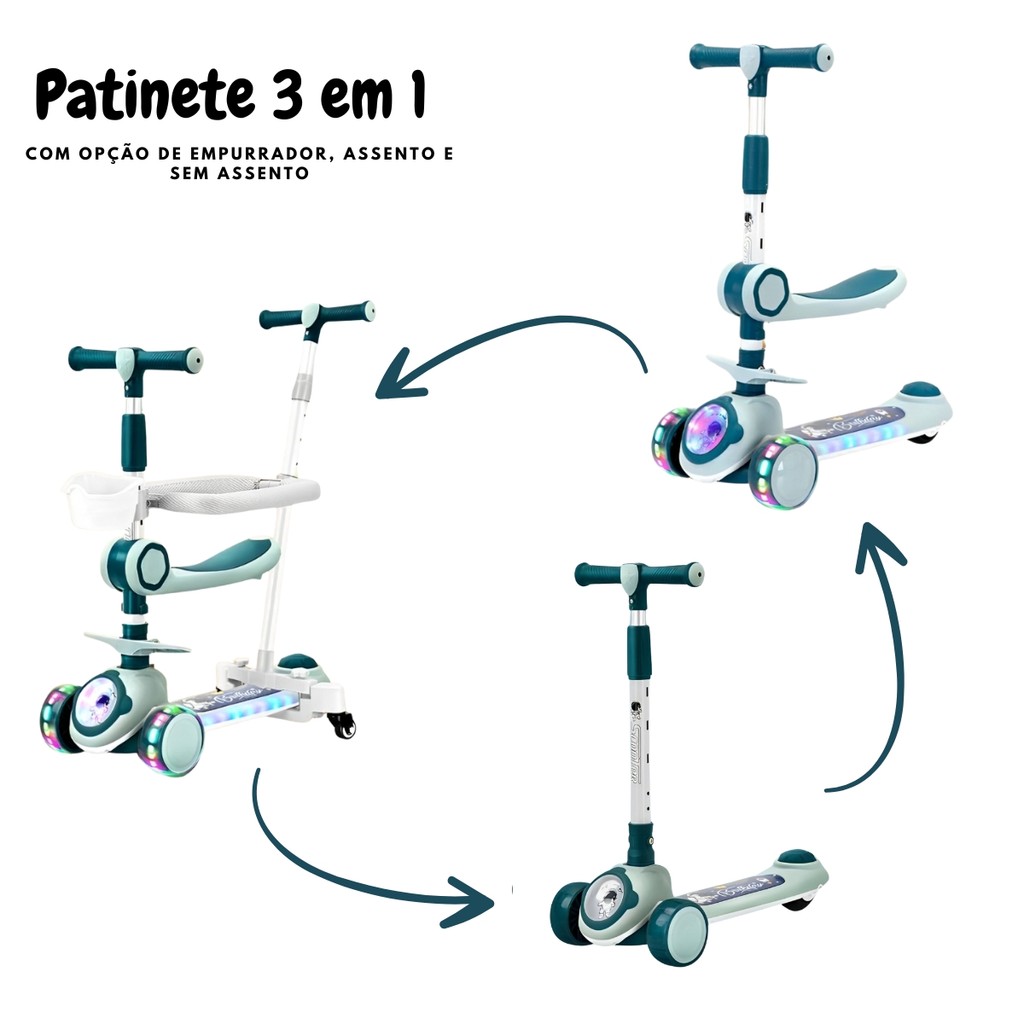 Patinete Infantil 3 em 1 Com Cesto Luzes Som Empurrador Azul Importway