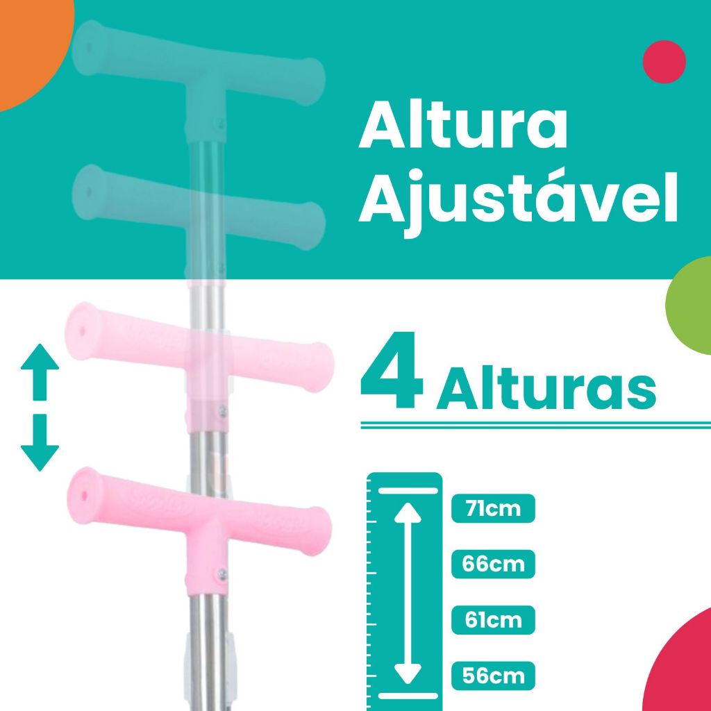 Patinete Infantil 3 rodas menino menina A combinação perfeita de diversão e segurança está garantida com este patinete infantil dobrável com guidão emborrachado. Por ser dobrável, é fácil de transportar para qualquer lugar e as rodinhas de segurança na parte da frente, garantem o equilíbrio da criança. Embalagem patinete 3 rodas contém: 1 patinete infantil desmontado; Observações patinete luz de led: Pode ser usado em pisos frios, lisos, sintéticos e madeira; Recomendado para crianças à partir de 3 anos; Luz de led nas 3 rodas; Possui freio traseiro; Não acompanha acessórios de proteção; Suporta até 30kg; Não acompanha campainha/buzina. Não possui som. O guidão é fixo, não gira 360 graus. A base para o pé da criança possui 30cm. Níveis de ajuste do guidão: 56cm / 61cm / 66cm / 71cm Medidas patinete infantil scooter: Comprimento patinete infantil: 57cm Largura patinete infantil: 21cm Altura patinete infantil: 72cm Materiais da patinete articulado: Patinete: plástico e metal. Rodas: gel, mais silenciosa e durável.