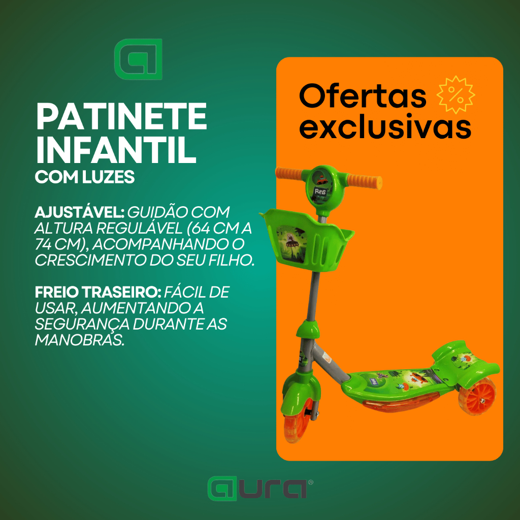 Patinete Infantil 3 Rodas Aventura 2 em 1 com Luzes - Diversão e Segurança Garantidas! Proporcione horas de diversão ao ar livre com o Patinete Infantil 3 Rodas Joaninha 2 em 1! Ideal para crianças a partir de 3 anos, ele combina segurança, praticidade e muita diversão. Feito com materiais resistentes, garante uma brincadeira segura e confortável. Destaques do Produto: 2 em 1: Assento removível para brincar em pé ou sentado. 3 Rodas: Maior estabilidade e equilíbrio, reduzindo riscos de quedas. Luzes nas Rodas: Proporciona um visual divertido enquanto a criança se movimenta. Ajustável: Guidão com altura regulável (64 cm a 74 cm), acompanhando o crescimento do seu filho. Freio Traseiro: Fácil de usar, aumentando a segurança durante as manobras. Especificações: Material: PP, Alumínio, PVC, Nylon e Ferro Dimensões: Altura total: 74 cm | Largura total: 18 cm Peso: Aproximadamente 3,5 kg Recomendações de Uso: Utilize em superfícies secas, lisas e planas. Indicado para crianças a partir de 3 anos. Conteúdo da Embalagem: 1 Patinete Infantil 3 Rodas Joaninha 2 em 1 com Luzes Garanta já o patinete que vai transformar o lazer do seu pequeno em pura alegria!