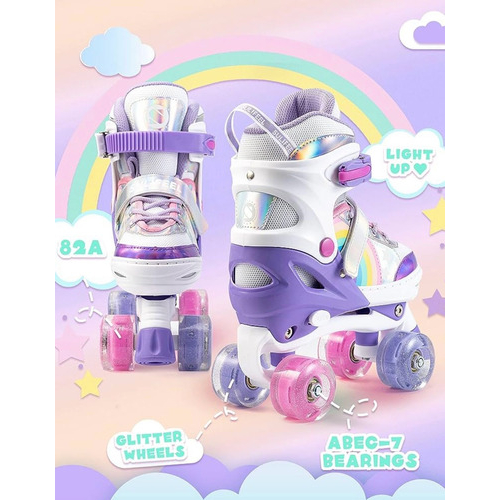 Os patins podem ser ajustados para 3 tamanhos diferentes para caber em diferentes comprimentos de pé (Esse patins possui um botão ao lado no qual você aperta e puxa o bico pra frente pra aumentar o tamanho em até 3 três números). O design ajustável significa que você não terá que comprar novos patins a cada poucos meses. É uma escolha perfeita para crianças em crescimento. Tamanhos disponíveis conforme estoque em anúncio. Rolamentos silenciosos de alta velocidade equipados, rodas de flash PU, rolha segura, para que seus filhos possam desfrutar do passeio suave, rápido e confortável. Andar de patins pode ser uma excelente maneira de ser fisicamente ativo e melhorar o humor das crianças, ajuda a reduzir o estresse enquanto se diverte. E os patins são adequados para iniciantes, mesmo para crianças pequenas. Material da roda: Poliuretano Tipo de fechamento: Gancho com regulagem, velco e cadarço