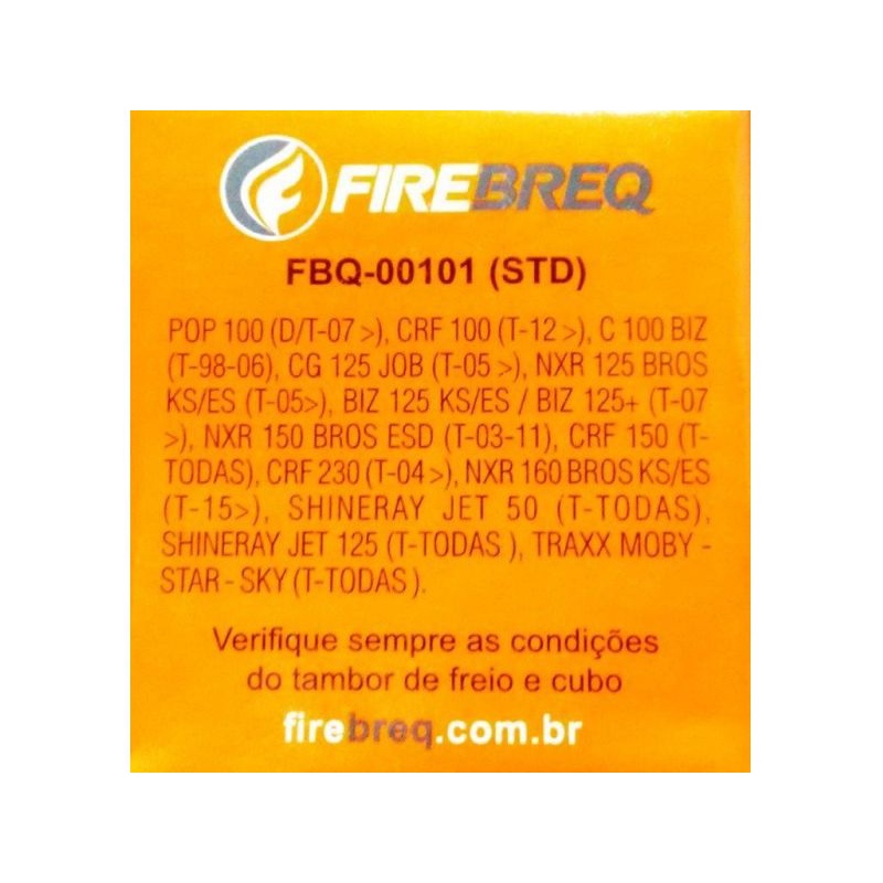 PATINS DE FREIO DE EXCELENTE QUALIDADE! Com baixo teor de materiais ferrosos e totalmente isentos de amianto, os produtos Firebreq são ecologicamente corretos, com alto poder de frenagem e baixo desgaste do cubo, proporcionando segurança e conforto aos clientes. ITENS NOVOS E ORIGINAIS DA MARCA FIREBREQ > Código do Fabricante: FBQ-00101 -B (0,50) > Garantia contra defeitos de fabricação. PRINCIPAIS APLICAÇÕES: (T) BIZ C 100 e 125 XL 125 BROS 125 e 150 XLX 125 CRF 230F POP 100 (D/T)