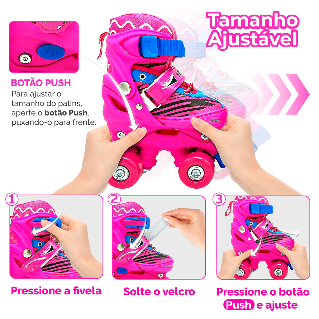 Este anúncio contém: 1 Patins Infantil Quad 4 Rodas Criança Ajustável com Kit de Proteção Na embalagem contém: 1 Capacete 1 Par de cotoveleiras 1 Par de joelheiras 1 Par de munhequeiras 2 Chaves. Disponíveis nas cores: AZUL ou ROSA SELECIONE A COR E TAMANHO DESEJADO NO MOMENTO DA COMPRA. TABELA DE NUMERAÇÃO DOS PATINS: TAM PP - Numeração 25 - 28: Comprimento interno mínimo de 17,5 cm até máximo de 19 cm TAM P - Numeração 29 - 32: Comprimento interno mínimo de 19 cm até máximo de 21,5 cm. FÁCIL DE AJUSTAR: Para ajustar o tamanho dos patins, basta apertar o botão lateral (PUSH) e puxar o bico dos patins para frente. Transforme o lazer dos seus pequenos em pura diversão com os Patins Infantil Quad 4 Rodas! Ajustáveis e com um design colorido, eles proporcionam uma experiência de patinação segura e confortável, incentivando atividades físicas desde cedo. O kit completo inclui capacete, joelheiras, cotoveleiras e protetores de punho, garantindo proteção total. Ideal para iniciantes, esses patins de alta qualidade oferecem estabilidade e controle, permitindo que as crianças desenvolvam suas habilidades com confiança e segurança. Características do produto: Marca: Justfun Idade mínima recomendada: 4 anos Peso máximo suportado: 75 kg Tamanho das rodas: 50 mm Botão PUSH para ajuste fácil e rápido Certificado de segurança INMETRO Freio frontal Fechamento com velcro e trava para melhor fixação. Dimensões da embalagem: Largura: 17 cm Altura: 31 cm Comprimento: 32 cm. Dúvidas frequentes: 1 - Trabalhamos apenas com produtos novos, com garantia de 3 meses. 2 - Produto a pronta entrega. 3 - Seus produtos serão enviados em até 24 horas úteis após a confirmação do pagamento. Não achou o que procura? Ficou com alguma dúvida sobre o produto? Fale conosco através do campo de perguntas.