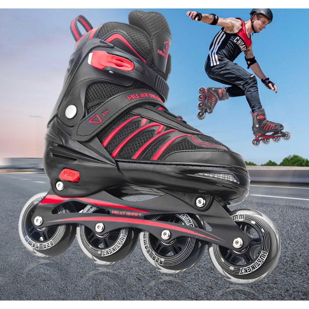 PATINS HUATINENT AJUSTÁVEIS - CONFORTO, ESTILO e PERFORMACE PARA TODOS! Tamanho Ajustável – Ideal para todas as idades! Os patins Huatinent oferecem um ajuste perfeito, com modelos que vão do Tamanho - M - ( 33 ao 35 ) Tamanho - G - ( 37 ao 39 ) Tamanho - XG - ( 40 ao 43) PESO: 120 kgs Assim, você pode garantir um ajuste confortável e seguro para os pés em crescimento ou quem procura um patins versátil. FÁCIL AJUSTE – Com um sistema de ajuste simples, você pode adaptar os patins ao tamanho do seu pé, permitindo que sejam usados por várias pessoas ou por um longo período, sem perder o conforto e a segurança. DESEMPENHO SUPERIOR– Equipados com rodas de alta resistência e rolamentos rápidos ABEC-7 de alta qualidade, saltos grandes de poliuretano (PU) 82A e estrutura de alumínio reforçado, atendem às necessidades de iniciantes e jovens skatistas, são perfeitos para quem gosta de velocidade e manobras radicais, ou para quem busca um passeio tranquilo no parque. FECHAMENTO SEGURO– Proteção tripla, sistema de fechamento com cadarços, alça de 45° e fivela de alta resistência, certamente fornecerão suporte para o tornozelo e protegerão você ao longo do caminho, pois proporcionam estabilidade e segurança para seus pés enquanto você patina. CONTÉM NA EMBALAGEM 01 PAR DE PATINS HUATINENT 01 FREIO PARA INSTALAR 01 PAR DE CHAVES ALLEN ( para regulagem das rodinhas, até mesmo troca-las) OBS: ( PATINS MODELOS (INLINE) CONTÉM FREIO APENAS DE UM LADO DO PÉ )