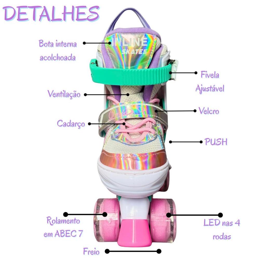 🛼 PATINS COM LED NAS RODINHAS – ARCO-ÍRIS 🌈 Conforto, diversão e segurança para as crianças! Ideal para crianças iniciantes ou que já amam patinar, este patins com rodinhas de LED e design arco-íris transforma cada passeio em uma experiência divertida, segura e cheia de estilo ✨ 📏 TAMANHO AJUSTÁVEL – ACOMPANHA O CRESCIMENTO Os patins podem ser ajustados para até 3 tamanhos diferentes, adaptando-se a diversos comprimentos de pé. O ajuste é simples: basta pressionar o botão lateral e puxar o bico para frente, aumentando o tamanho em até três números. ✔️ Ideal para crianças em fase de crescimento ✔️ Evita a necessidade de trocar de patins com frequência ⚙️ FÁCIL AJUSTE E CONFORTO Sistema de regulagem prático que garante um encaixe confortável e seguro, permitindo uso prolongado sem perder estabilidade. 🚀 DESEMPENHO SUAVE E SILENCIOSO 🛞 Rodas em Poliuretano (PU) com LED – mais resistência, aderência e visual encantador ⚡ Rolamentos ABEC-7 – maior velocidade e deslizamento silencioso 🛑 Rolha de segurança – mais controle e segurança nas paradas Perfeito para passeios tranquilos e para quem está aprendendo a patinar. 🔒 FECHAMENTO SEGURO E ESTÁVEL Sistema de fechamento completo para maior firmeza e proteção dos pés: ✔️ Gancho com regulagem ✔️ Velcro reforçado ✔️ Cadarço Mais equilíbrio, conforto e segurança durante o uso. 👧🧒 IDEAL PARA CRIANÇAS E INICIANTES Andar de patins incentiva a atividade física, melhora o humor 😊 e ajuda a reduzir o estresse, tudo isso de forma divertida e saudável. 📌 OBSERVAÇÕES IMPORTANTES 📦 Produto importado 👟 Numeração equivalente à de calçados fechados ❗ Para qualquer tipo de devolução, o produto não pode ter sido usado