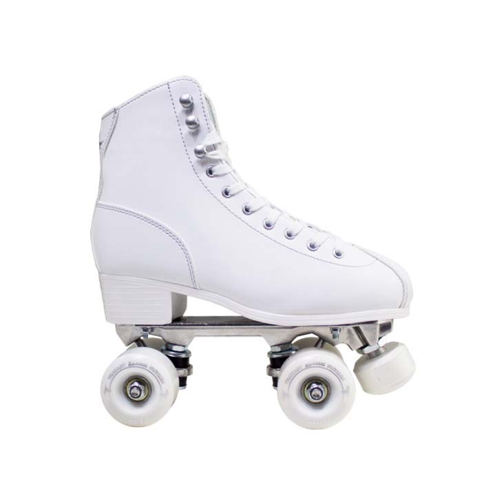 O Patins Quad Traxart Klassic Branco é um modelo de quad com um look bem retrô. Destaque pelo seu design e firmeza da bota. Modelo que pode ser usado em quadras poliesportivas, rinques de patinação asfaltos lisos e ruas pouco acidentadas; assim você pode passear, dançar e curtir. Suporta até 100kg. O Klassic é feito em bota única com cano alto bem firme de couro. A bota além de ser costurada, assim sendo mais reforçada. As rodas são de poliuretano (PU) de 58mm com dureza 83A, e os rolamentos são ABEC-5. A base é de alumínio e o freio é regulável em ambos os pés para maior comodidade do patinador. Consulte a tabela de tamanho para a indicação de qual o tamanho ideal para você. Qualquer dúvida entre em contato com nosso atendimento. Categoria: Quad | Base: Alumínio | Freio: Regulável | Rolamentos: ABEC-5 | Rodas: PU 58mm x 32mm Dureza: 83A | Suporta até: 100kg | Tamanhos: #4 - #10 (33-40)