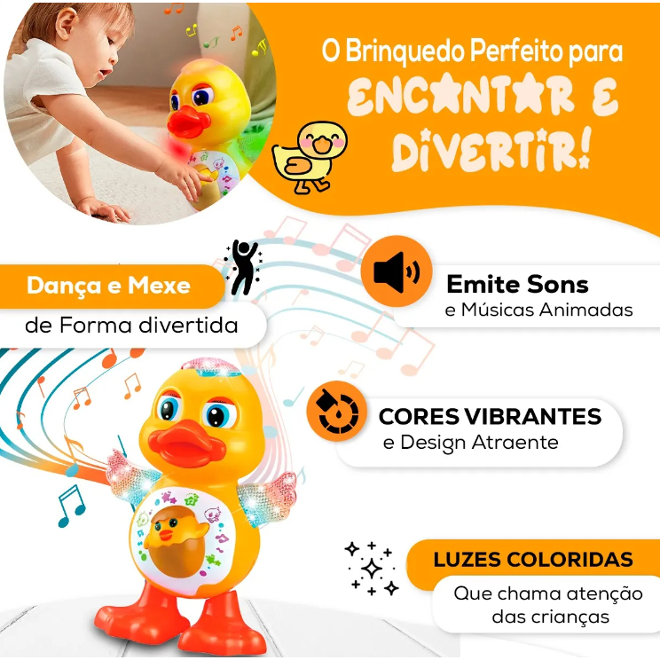 Diversão garantida para as crianças! O Pato Dançante anda, dança, toca música e ascende luzes colorida, estimulando a atenção e a coordenação motora dos pequenos. atenção: não acompanha pilhas