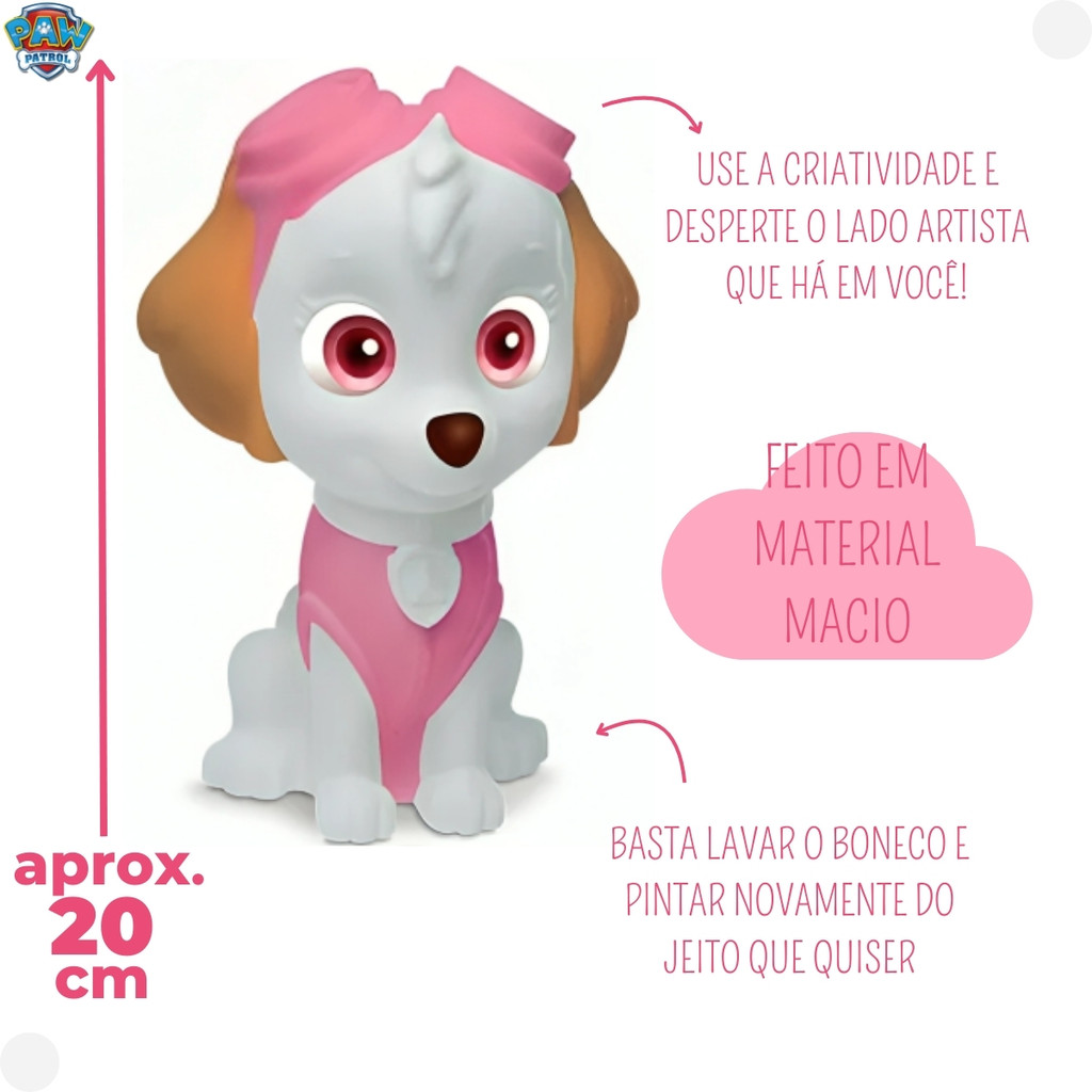 DESCRIÇÃO DO PRODUTO Um boneco da cachorrinha mais amada da Patrulha Canina para pintar e brincar. E melhor ele é lavável, é só lavar e a brincadeira recomeça! Vem com 5 tintas e pincel. Desenvolve a criatividade, coordenação motora e estimula os sentidos da criança. CARACTERÍSTICAS TÉCNICAS: Conteúdo da Embalagem: Inclui um boneco, 5 potes de tinta e um pincel. Dimensões Aproximadas do Produto: 19cm x 13cm x 6cm (Altura x Largura x Comprimento/Profundidade). Dimensões Aproximadas da Embalagem: 13cm x 18cm x 26cm (Altura x Largura x Comprimento/Profundidade). Material/Composição: Plástico, PVC e tinta atóxicos, pincel e adesivo. Idade Mínima Recomendada: A partir de 4 anos Participantes: A partir de 1 pessoa Alimentação: Não se aplica Marca: Elka Referência: 1289 Outras informações: As cores podem variar entre as imagens mostradas acima e o produto. Imagens meramente ilustrativas. Aviso: As informações e imagens divulgadas são de total responsabilidade do fabricante/fornecedor. Produto lacrado e disponível a pronta entrega para todo Brasil! APROVADO PELO INMETRO