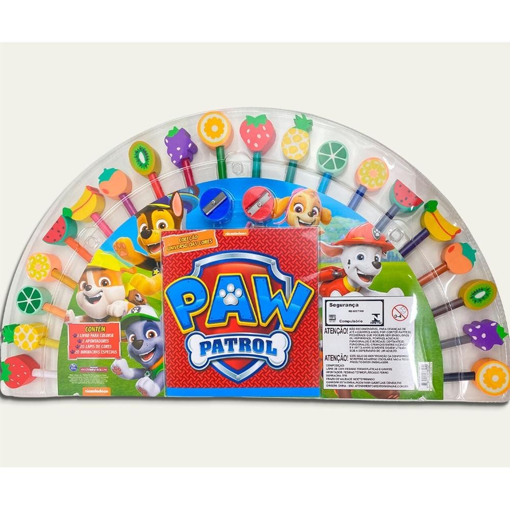 A Coleção Universo das Cores - Patrulha Canina convida as crianças a se juntarem aos heróis caninos favoritos em aventuras coloridas, estimulando a criatividade e a diversão enquanto dão vida aos personagens da Patrulha Canina. Acompanha 1 livro para colorir com 48 páginas, 2 apontadores, 20 lápis de cores e 20 borrachas especiais.