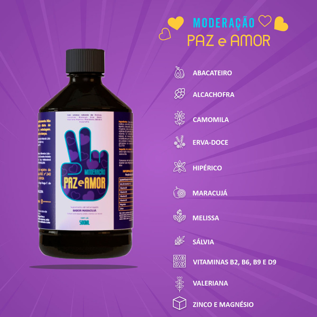 Moderação Paz e Amor é um blend de ervas naturais e vitaminas desenvolvido para trazer tranquilidade e aliviar o estresse do dia a dia, sem causar sonolência. Pensado para ser consumido diariamente e nos momentos em que a tensão pode estar acumulada, possui um sabor agradável de maracujá, com absorção imediata pelo organismo. Sua fórmula é 100% natural e o consumo muito prático para as rotinas movimentadas. Sua composição foi elaborada por nutricionistas e estudada para atingir os resultados de forma 100% natural, com ingredientes de qualidade que se complementam e formam uma combinação surreal e exclusiva. Então não perca tempo, tenha mais disposição com Moderação Paz e Amor, recupere a leveza da vida!