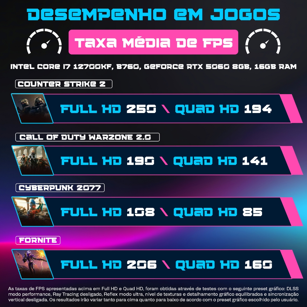 ::::: TODO GUERREIRO VENCEDOR POSSUI UMA AURA FORTE ::::: Ela te protege e emana toda a energia que o torna dominador no campo de batalha. Por isso jogadores sérios e exigentes escolhem os computadores AURA by BluePC. Eles sabem da importância de ter um profissional para estarem sempre um passo a frente. Não basta "rodar" o jogo, você precisa dominar o campo de batalha. E para isso, os processadores da linha AURA foram meticulosamente escolhidos para extraírem o máximo da sua potente placa de vídeo Nvidia GeForce RTX da série 50. Não seja apenas um mero participante nos seus jogos favoritos. A potência combinada dos múltiplos núcleos e theads do processador, associada a todas as tecnologias de ponta envoltas na sua placa de vídeo como DLSS, Ray Tracing 4, Tensor Cores e Reflex, farão com que o seu desempenho seja único. Elimine seu oponente antes que ele consiga enxergar você. Obviamente a diversão faz parte da jogatina, mas este computador irá levar você além, te conduzirá até o topo. Especificações Técnicas: Intel Core i7 12700KF O DESEMPENHO QUE TODO JOGADOR SÉRIO EXIGE Com clock de até 5.0Ghz, distribuído em 12 núcleos e 20 threads, o seu nível de jogo será elevado a um patamar sublime. A performance deste processador em jogos é tão incrível que faltam palavras que definam toda a sua potência em alta definição. - Desenvolvedor: Intel - Geração: 12ª <b/>PLACA MÃE: Nada de chipset de entrada, aqui é B760 Chipset avançado, rico em recursos e tecnologias avançadas - Desenvolvedor do chipset: Intel - Modelo do chipset: B760 - Suporte a processadores: Até i9 de 14ª geração - Suporte a memória RAM: Até 128GB - Slots de memória: 2 - Tecnologia memória RAM: DDR5 - Frequência suportada: até 5200Mhz e 6800Mhz (O.C) - VRM: Múltiplos de alta eficiência Slots de expansão: - 1x Slot PCIe 3.0 x4 (placas diversas) - 1x Slot PCIe 4.0 x16 (placa de vídeo) Slots de armazenamento:<b/> - 3x SATA de 6gb/s - 1x Slot M.2 (M) NVMe 2242/2260/2280 Áudio: - Alta definição 7.1 canais com 3 conexões Rede LAN: - Gigabit RJ45 10/100/1000 Portas USB: - 4x USB-A 3.2 - 4x USB-A 2.0 - Cabo extensor com mais 2 USB-A 3.2 Placa de vídeo: Velocidade e Gráficos Inigualáveis Impulsionados por IA. - O DLSS é um avanço revolucionário em tecnologias de renderização neural que utiliza IA para aumentar o FPS, reduzir a latência e aprimorar a qualidade de imagem. O incrível avanço do DLSS 4, traz o novo Multi Frame Generation e melhorias ao Super Resolution, impulsionado pelas placas de vídeo GeForce RTX™ Série 50 e os Tensor Cores de 5ª Geração. Ativar o DLSS em uma GeForce RTX é o melhor jeito para jogar suportado pela IA dos supercomputadores da NVIDIA em nuvem que estão em constante melhorias para o seu setup gamer. Realismo Revolucionário - A Arquitetura NVIDIA Blackwell proporciona toda a glória e realismo do Ray Tracing Completo. Experimente gráficos com qualidade cinematográfica e com velocidade sem precedentes graças as GeForce RTX Série 50, com RTX Cores de 4ª Geração, e aos avanços tecnológicos de renderização neural, acelerados com a 5ª Geração de Tensor Cores. Competindo em Alta Velocidade<b/> - As tecnologias Reflex otimizam o pipeline gráfico para uma capacidade de resposta mais rápida, permitindo acertar os alvos mais rapidamente, conseguir tempos de reação mais curtos e maior precisão de mira em jogos competitivos. O novo Reflex 2 traz o Frame Warp, que reduz ainda mais a latência com base no click do mouse no jogo. - Desenvolvedor: Nvidia - Série: GeForce - Modelo: RTX 5060 - Memória VRAM: 8GB GDDR7 - Conexões de vídeo: 2x Display port e 2x HDMI - Tecnologias: DLSS 4, Tensor cores 5, Ray tracing 4 - Cuda cores: 3840 - G-Sync: Sim - Resolução máxima: 8K Memória: - Tipo: RAM - Tecnologia: DDR5 - Frequência: 5200Mhz - Capacidade: 16GB Armazenamento: - Tipo: SSD - Conexão: M.2 - Tecnologia: NVMe PCIe - Capacidade: 1TB Fonte de alimentação: - Format: ATX - Tipo: Gamer - Certificação: 80 Plus Bronze - Potência: 750W - PFC: Ativo - Bivolt automático: Sim Gabinete: - Tipo: Gamer - Formato: ATX - Material frontal: ABS de alta qualidade - Material lateral: Vidro temperado resistente - Proteção para fonte de alimentação: Sim, PSU cover - Conexão: 2x USB 2x Áudio - Cor: Preto - Material: Aço e alumínio - Acabamento: Premium - Sistema de refrigeração: 3 LED fans coolers 120x120mm, 2 na parte superior* e 1 na parta traseira *Dependendo do modelo disponível em estoque os 3 fans podem ser instalados na parte frontal do gabinete Refrigeração: - Tipo: Water Cooler - Tecnologia: Bomba com mangueiras - Iluminação: RGB - Dimensão do fan: 120mm x 2 (240mm) - Materiais dissipadores: Alumínio e cobre Produzido por BluePC Computadores -> Modelo: PGBP-AUR150