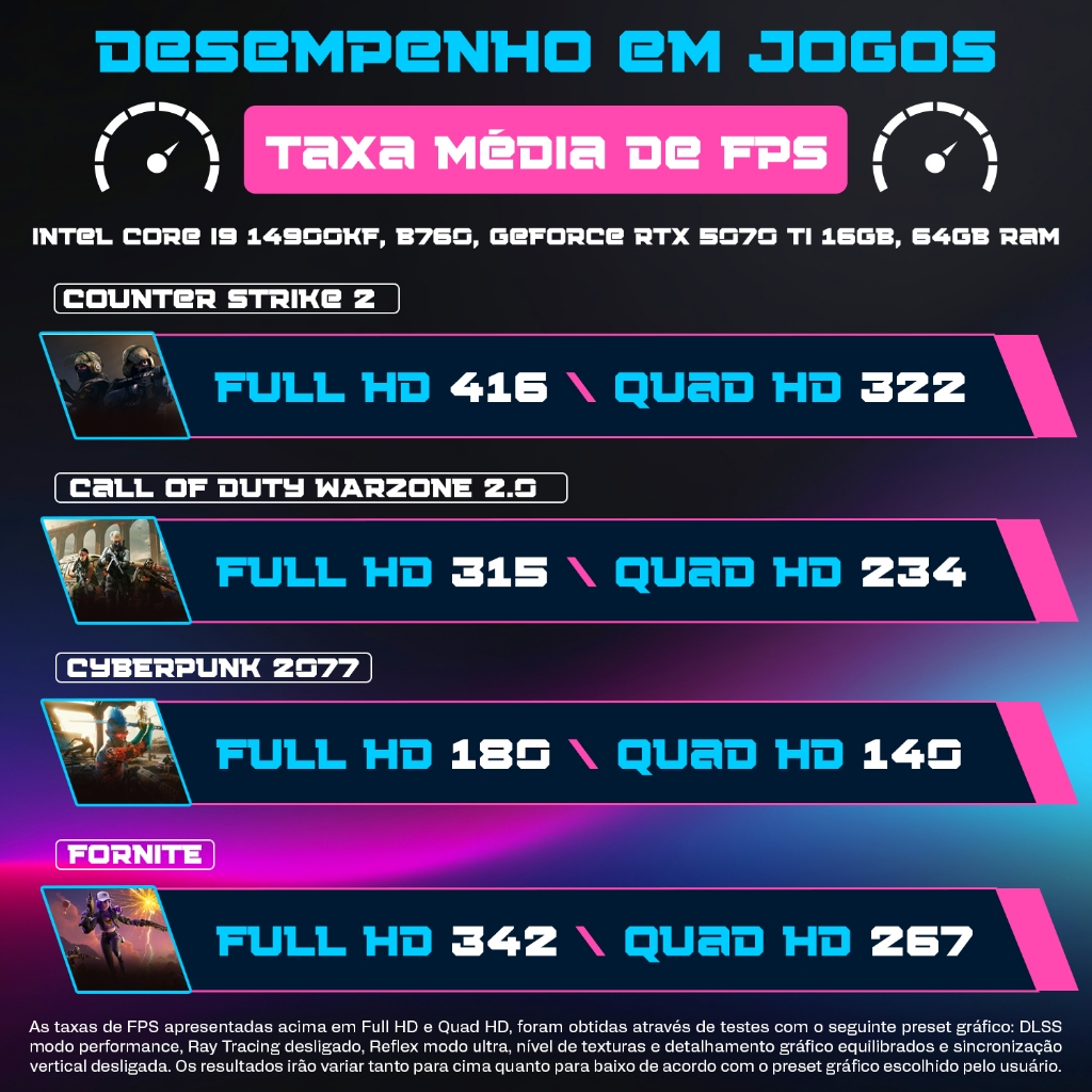 ::::: TODO GUERREIRO VENCEDOR POSSUI UMA AURA FORTE ::::: Ela te protege e emana toda a energia que o torna dominador no campo de batalha. Por isso jogadores sérios e exigentes escolhem os computadores AURA by BluePC. Eles sabem da importância de ter um profissional para estarem sempre um passo a frente. Não basta "rodar" o jogo, você precisa dominar o campo de batalha. E para isso, os processadores da linha AURA foram meticulosamente escolhidos para extraírem o máximo da sua potente placa de vídeo Nvidia GeForce RTX da série 50. Não seja apenas um mero participante nos seus jogos favoritos. A potência combinada dos múltiplos núcleos e theads do processador, associada a todas as tecnologias de ponta envoltas na sua placa de vídeo como DLSS, Ray Tracing 4, Tensor Cores e Reflex, farão com que o seu desempenho seja único. Elimine seu oponente antes que ele consiga enxergar você. Obviamente a diversão faz parte da jogatina, mas este computador irá levar você além, te conduzirá até o topo. Especificações Técnicas: Intel Core i9 14900KF PARA QUEM NÃO ACEITA NADA MENOS DO QUE O TOPO Se você exige nível profissional, este é o processador ideal para você. Com 24 núcleos e 32 threads, qualquer jogo ou aplicação profissional será executado de maneira única. Com até 6.0Ghz de clock, a fluidez para qualquer desafio está garantida. - Desenvolvedor: Intel - Geração: 14ª PLACA MÃE: Nada de chipset de entrada, aqui é B760 Chipset avançado, rico em recursos e tecnologias avançadas - Desenvolvedor do chipset: Intel - Modelo do chipset: B760 - Suporte a processadores: Até i9 de 14ª geração - Suporte a memória RAM: Até 128GB - Slots de memória: 2 - Tecnologia memória RAM: DDR5 - Frequência suportada: até 5200Mhz e 6800Mhz (O.C) - VRM: Múltiplos de alta eficiência Slots de expansão: - 1x Slot PCIe 3.0 x4 (placas diversas) - 1x Slot PCIe 4.0 x16 (placa de vídeo) Slots de armazenamento: - 3x SATA de 6gb/s - 1x Slot M.2 (M) NVMe 2242/2260/2280 Áudio: - Alta definição 7.1 canais com 3 conexões Rede LAN: - Gigabit RJ45 10/100/1000 Portas USB: - 4x USB-A 3.2 - 4x USB-A 2.0 - Cabo extensor com mais 2 USB-A 3.2 Placa de vídeo: Velocidade e Gráficos Inigualáveis Impulsionados por IA. O DLSS é um avanço revolucionário em tecnologias de renderização neural que utiliza IA para aumentar o FPS, reduzir a latência e aprimorar a qualidade de imagem. O incrível avanço do DLSS 4, traz o novo Multi Frame Generation e melhorias ao Super Resolution, impulsionado pelas placas de vídeo GeForce RTX™ Série 50 e os Tensor Cores de 5ª Geração. Ativar o DLSS em uma GeForce RTX é o melhor jeito para jogar suportado pela IA dos supercomputadores da NVIDIA em nuvem que estão em constante melhorias para o seu setup gamer. Realismo Revolucionário A Arquitetura NVIDIA Blackwell proporciona toda a glória e realismo do Ray Tracing Completo. Experimente gráficos com qualidade cinematográfica e com velocidade sem precedentes graças as GeForce RTX Série 50, com RTX Cores de 4ª Geração, e aos avanços tecnológicos de renderização neural, acelerados com a 5ª Geração de Tensor Cores. Competindo em Alta Velocidade As tecnologias Reflex otimizam o pipeline gráfico para uma capacidade de resposta mais rápida, permitindo acertar os alvos mais rapidamente, conseguir tempos de reação mais curtos e maior precisão de mira em jogos competitivos. O novo Reflex 2 traz o Frame Warp, que reduz ainda mais a latência com base no click do mouse no jogo. - Desenvolvedor: Nvidia - Série: GeForce - Modelo: RTX 5070 Ti - Memória VRAM: 16GB GDDR7 - Conexões de vídeo: 2x Display port e 2x HDMI - Tecnologias: DLSS 4, Tensor cores 5, Ray tracing 4 - Cuda cores: 8960 - G-Sync: Sim - Resolução máxima: 8K Memória: - Tipo: RAM - Tecnologia: DDR5 - Frequência: 5600Mhz - Capacidade: 64GB - Sistema: Dual Channel Armazenamento: - Tipo: SSD - Conexão: M.2 - Tecnologia: NVMe PCIe - Capacidade: 1TB Fonte de alimentação: - Format: ATX - Tipo: Gamer - Certificação: Bronze - Potência: 850W - PFC: Ativo - Bivolt automático: Sim Gabinete: - Tipo: Gamer - Formato: ATX - Material frontal: ABS de alta qualidade - Material lateral: Vidro temperado resistente - Proteção para fonte de alimentação: Sim, PSU cover - Conexão: 2x USB 2x Áudio - Cor: Preto - Material: Aço e alumínio - Acabamento: Premium - Sistema de refrigeração: 3 LED fans coolers 120x120mm, 2 na parte superior* e 1 na parta traseira *Dependendo do modelo disponível em estoque os 3 fans podem ser instalados na parte frontal do gabinete Refrigeração: - Tipo: Water Cooler - Tecnologia: Bomba com mangueiras - Iluminação: RGB - Dimensão do fan: 120mm x 2 (240mm) - Materiais dissipadores: Alumínio e cobre -> Produzido por BluePC Computadores -> Modelo: PGBP-AUR171