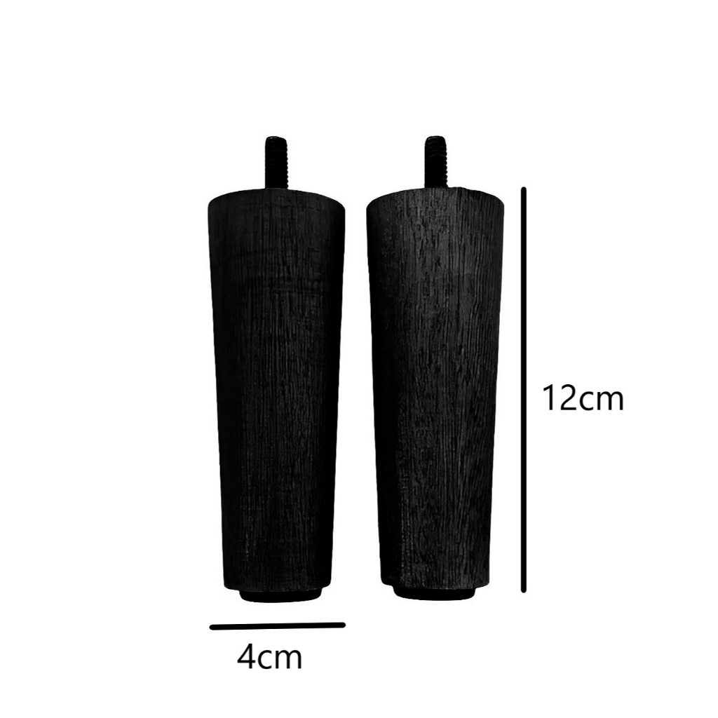 Modelo: CÔNICO Cor: PRETO Material/Composição: MADEIRA MACIÇA Rosca: 5/16 (rosca padrão de todas as camas box e baú de fabricação nacional). Quantidade do anúncio: 5 PÉS FIXOS E 2 PÉS COM RODINHAS Base: SAPATA PLÁSTICA Altura total, sem contar com o parafuso: 12 CM Altura do pé com rodinhas, sem contar o parafuso: 12 CM Acompanha buchas ou porcas: NÃO