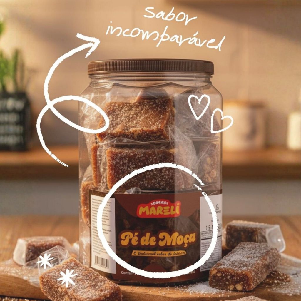 Pé de Moça Doces Mareli – O Tradicional Sabor do Interior em Cada Mordida! Pote com 20 unidades! Peso total de 1Kg. ---------- Descubra o irresistível Pé de Moça Doces Mareli, uma verdadeira joia da culinária caseira brasileira. Feito com amendoim selecionado e uma combinação cremosa de leite, açúcar e ingredientes de alta qualidade, este doce traz aquele sabor nostálgico das receitas preparadas no fogão a lenha, como nos velhos tempos do interior. Com textura macia, levemente amanteigada e pedacinhos crocantes de amendoim, o Pé de Moça Mareli transforma qualquer momento em uma pausa deliciosa — perfeito para acompanhar o café, receber visitas, montar cestas, revender ou simplesmente matar aquela vontade de um docinho tradicional. ---------- Por que você vai amar o Pé de Moça Mareli? Sabor autêntico do interior – receita tradicional, cremosa e irresistível. Amendoim de alta qualidade – sabor marcante e textura perfeita. Docinho pronto para consumo – ideal para lanches, sobremesas ou lembrancinhas. Praticidade e ótimo custo-benefício – embalagem com 20 unidades. Não contém glúten – opção segura para quem possui restrições alimentares. ---------- Informações importantes: Contém derivados de amendoim. Pode conter trigo, coco e leite. Alto em açúcar adicionado e gordura saturada. Peso líquido aproximado: 1,010 g (20 unidades). Experimente o verdadeiro gostinho caseiro! ---------- Ingredientes: Amendoim, água, mistura láctea condensada de leite e soro de leite, xarope de glicose, margarina (geneticamente modificados a partir do Agrobacterium tumefaciens e/ou Bacillus thuringiensis e/ou Delftia acidovorans e/ou Stenotrophomonas maltophilia e/ou Streptomyces viridochromogenes e/ou Zea mays) e açúcar. ALÉRGICOS: CONTÉM DERIVADOS DE AMENDOIM, PODE CONTER TRIGO, COCO E LEITE. NÃO CONTÉM GLÚTEN. ---------- Marca: DOCES MARELI Produto: Pé de Moça Quantidade: Contém 20 unidades Peso Líquido: 1,010 g ---------- O Pé de Moça Mareli é perfeito para quem busca qualidade, sabor e aquela memória afetiva que só um doce tradicional pode trazer. Ideal para casa, loja de conveniências, mercados, cafeterias ou consumo no dia a dia. Garanta já o seu e saboreie essa delícia que conquista gerações! IMAGENS MERAMENTE ILUSTRATIVAS.
