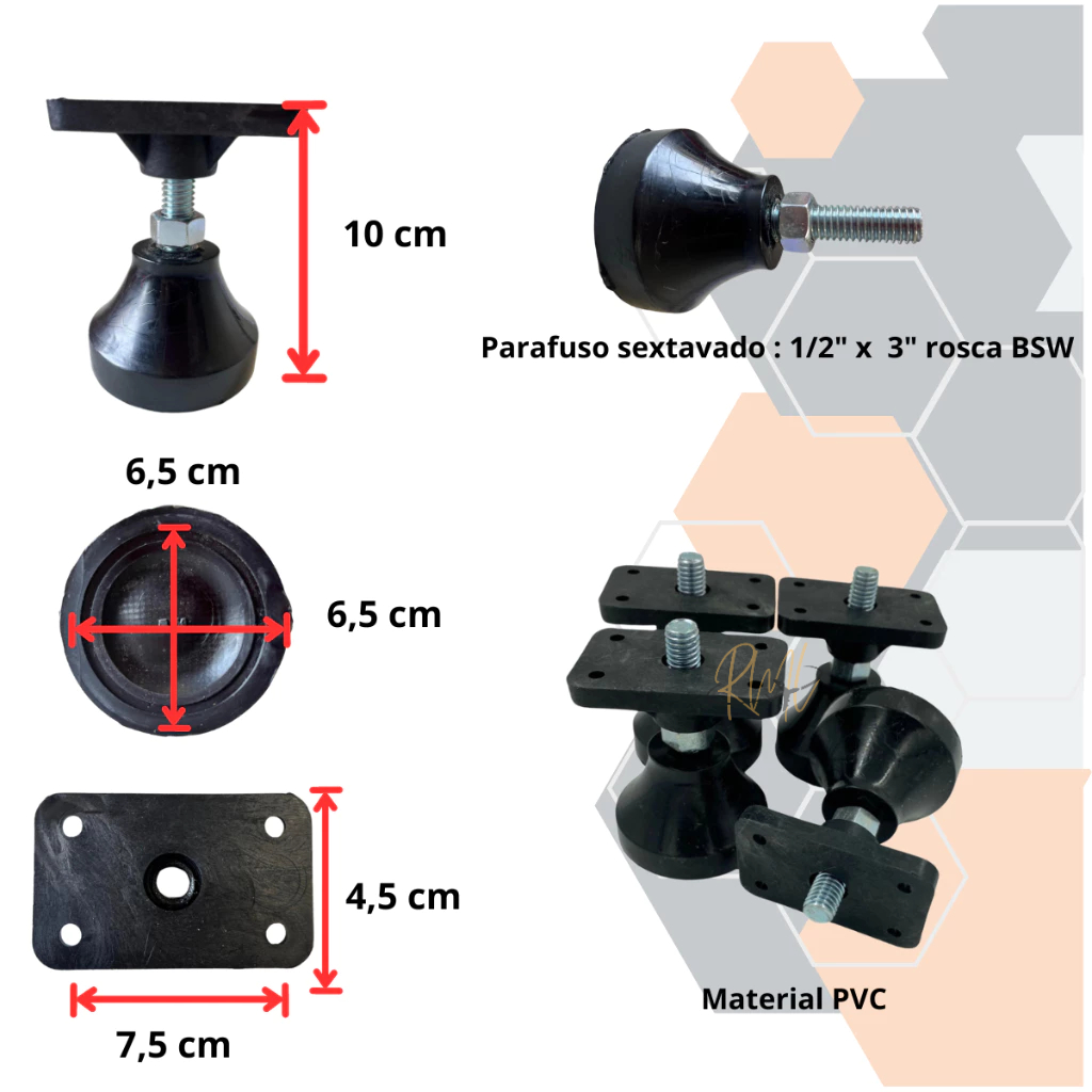 JOGO DE PÉ NIVELADOR PARA MESA DE BILHAR , SINUCA , PEBOLIM , TOTO E ETC. MARCA : BM BILHARES QUANTIDADE : 4 PEÇAS APLICA-SE EM MUITOS OUTROS TIPOS DE MESAS E EQUITAMENTOS . COMPOSIÇÃO: PARAFUSO SEXTAVADO 1/2" X 3 " ROSCA BSW PLÁSTICO ABS MATERIAL PRONTO À ENTREGA.