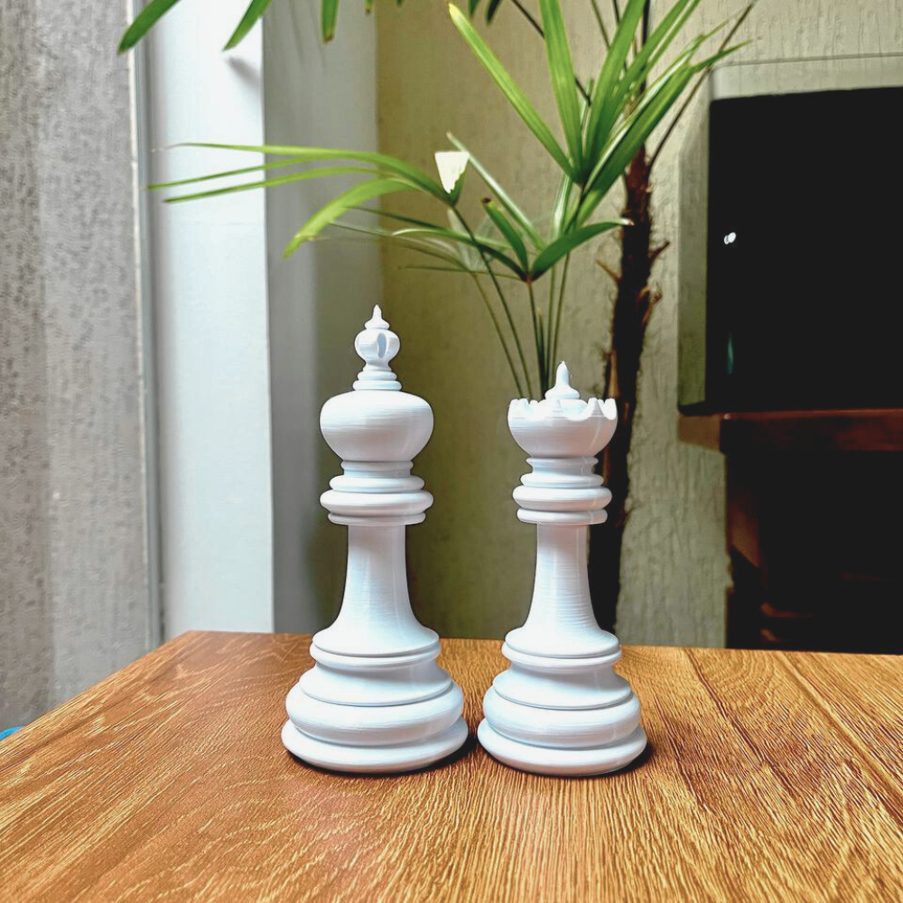 Peças de Xadrez Decorativas Brancas Feito com impressão 3D Material: Plástico PLA (Plástico biodegradável que não agride o meio ambiente) Rei 15cm Rainha 13cm Bispo 12cm Cavalo 11cm Torre 9cm Peão 8cm * Cuidados/Conservação: - Não é indicado deixar exposto ao sol e a temperaturas altas - Para limpeza utilizar pano seco ou úmido Lembre-se de que, devido à natureza da impressão 3D, alguns itens podem apresentar marcas sutis que são características desse processo.