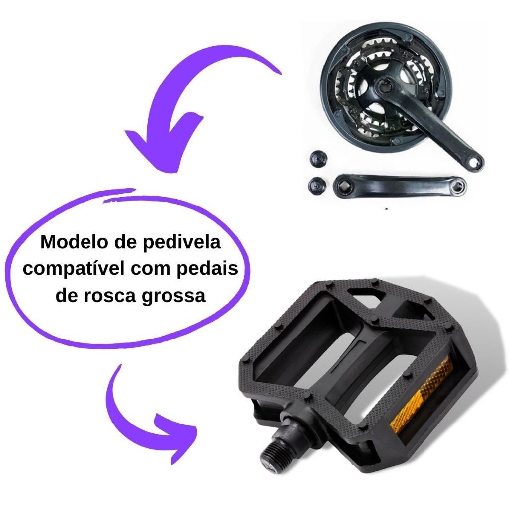 Pedal 9/16 plataforma nylon preto c/esfera cor: preto Com refletor e eixo com esfera Indicado para uso em bicicleta adulto conteúdo: 1 par ( lado direito + lado esquerdo) composição: alumínio, nylon e aço ================== Tipos de Rosca: Rosca Grossa x Rosca Fina --- Rosca Grossa Também conhecido como Rosca Inglesa possui eixo com rosca de medida 9/16” é mais comum em pedivelas de bicicletas modernas e utilizada em componentes de tecnologia mais atual. --- Rosca Fina Conhecida como Rosca Sueca possui eixo com rosca de medida 1/2″ é mais comum em pedivelas do tipo monobloco (aqueles em que os dois braços do pedivela são um bloco único em formato de S) é encontrado em bicicletas mais simples. ATENÇÂO: Esse modelo de pedal é rosca grossa!!!