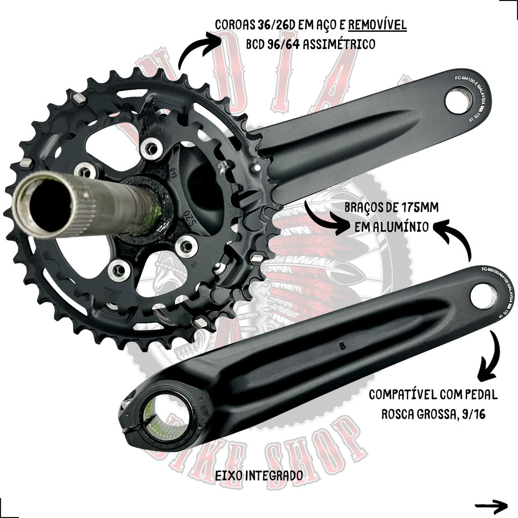PEDIVELA SHIMANO DEORE M4100 FC-M4100 175MM - COROAS 36/26D - 2X10V – SEM MOVIMENTO CENTRAL Atenção: - Não acompanha movimento central; - As coroas são removíveis e tem BCD ASSIMÉTRICO 96/64mm; - Pedivela exclusivo para quadros NÃO BOOST; - Compatível com quadros de MTB com eixo traseiro de 10x135mm ou 12x142mm. Descrição: O pedivela de mountain bike SHIMANO DEORE FC-M4100-2 proporciona trocas confiáveis e precisas para transmissões de 2x10 velocidades. Este pedivela tem eixo integrado de 24mm de diâmetro e oferece uma combinação de marchas 36-26D com linha de corrente de 48,8 mm. Compatível com quadro de MTB com comprimento do tubo do movimento central de rosca 68~73mm ou central Press fit BB92. Esse modelo de pedivela é compatível com quadros de MTB tradicionais, NÃO BOOST, com eixo traseiro de 10x135mm ou 12x142mm. Especificações: - Marca: Shimano; - Linha: DEORE M4100; - Modelo: FC-M4100-2; - Modalidade: MTB – XC / TRAIL; - Coroas: 36/26D – REMOVÍVEL C/ BCD ASSIMÉTRICO; - BCD Coroas: 96/64 milímetros - ASSIMÉTRICO; - Comprimento do Braço: 175mm; - Eixo: INTEGRADO – 24mm de diâmetro; - Chainline: 48.8mm; - Material: BRAÇOS – Alumínio, EIXO – Aço, COROAS - Aço; - Compatível com relações: 10v; - Rosca Pedal: 9/16 - Grossa; - Não Acompanha Movimento Central; - Cor: Preto; - Origem: MALÁSIA; - Peso Aproximado: 960g; - Part Number: EFCM41002EX66; - Cód. Barras: 4550170621162. Atenção: - Acompanha Embalagem Original; - Produto original SHIMANO e acompanha nota fiscal; - Garantia 01 ano SHIMANO BRASIL. Aguardamos o seu pedido! INDIAN BIKE SHOP