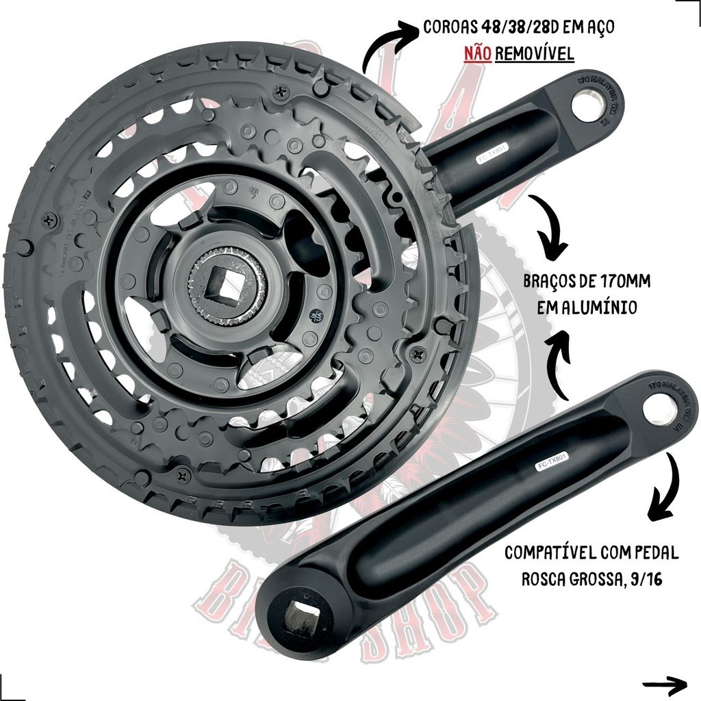 PEDIVELA SHIMANO TOURNEY TX FC-TX801 170MM PONTA QUADRADA - COROAS 48/38/28D - 3X7V / 3X8V – COM PROTEÇÃO P/ CORRENTE