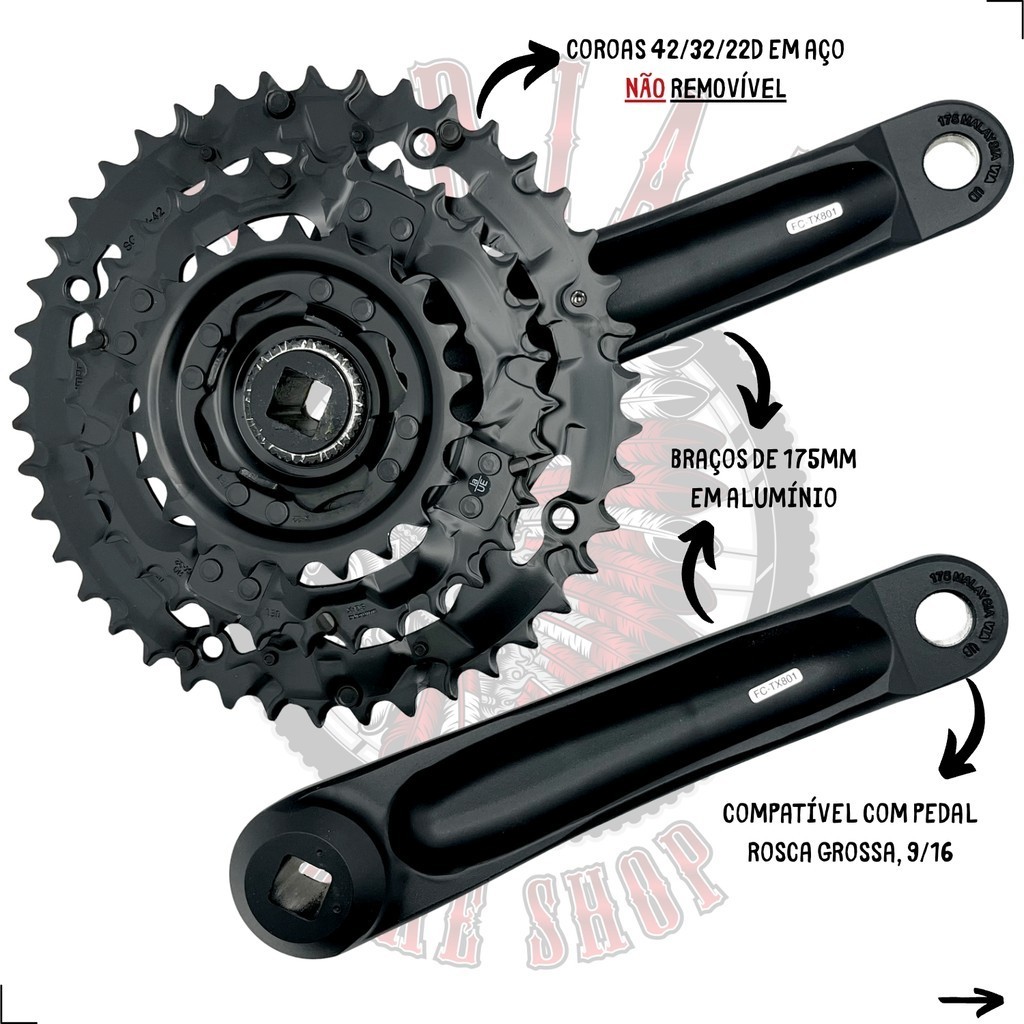 PEDIVELA SHIMANO TOURNEY TX FC-TX801 175MM PONTA QUADRADA - COROAS 42/32/22 - 3X7V / 3X8V Especificações: - Marca: Shimano; - Linha: Tourney TX; - Modelo: FC-TX801; - Modalidade: MTB / Urbano; - Coroas: 42/32/22D – Arrebitada / Não Removível; - Comprimento do Braço: 175mm; - Eixo: Ponta Quadrada; - Chainline: 50mm; - Material: Braços – Alumínio e Coroas – Aço; - Compatível com relações: 6 / 7 / 8 Velocidades; - Rosca Pedal: 9/16 - Grossa; - Não Acompanha Movimento Central; - Cor: Preto; - Origem: SINGAPURA; - Peso Aproximado: 970g; - Part Number: AFCTX801E222XL. Atenção: - Acompanha parafusos para instalação; - Item vendido pela Shimano Brasil em saco plástico; - Produto original SHIMANO; - Importado por BLUECYCLE, importador oficial Shimano no Brasil; - Garantia 01 ano SHIMANO BRASIL; - Acompanha nota fiscal. Aguardamos o seu pedido! INDIAN BIKE SHOP
