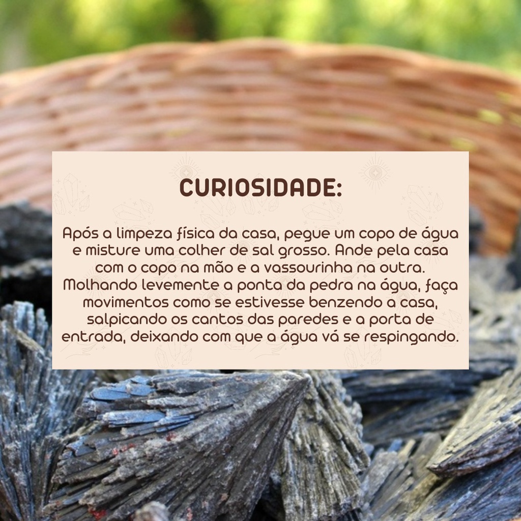 A Pedra Cianita Negra, conhecida como Vassoura de Bruxa, é um cristal natural extremamente poderoso para proteção espiritual e banimento de energias negativas. Amplamente utilizada para limpeza energética profunda, atua cortando cordões energéticos negativos e protegendo tanto o ambiente quanto as pessoas que nele circulam. Características Cristal natural Cianita Negra 100% original Conhecida como Vassoura de Bruxa Alta capacidade de proteção e banimento energético Auxilia na limpeza espiritual e corte de energias negativas Indicada para proteção de ambientes e pessoas Pedra natural selecionada Tamanho em torno de 5 cm Tonalidades e formatos podem variar por se tratar de produto natural Como usar Pode ser posicionada próxima a portas, janelas ou entradas Indicada para proteção energética de ambientes Pode ser utilizada em práticas espirituais, meditação ou rituais de limpeza Modos de cuidado Realizar limpeza energética regularmente Pode ser limpa com incenso, palo santo ou selenita Evitar quedas para preservar a estrutura do cristal Guardar em local seguro quando não estiver em uso O que acompanha 1 unidade de pedra Cianita Negra natural Envio diário pelos Correios. Respondemos todas as dúvidas pelo chat. Produto natural cuidadosamente selecionado para garantir qualidade e energia equilibrada.