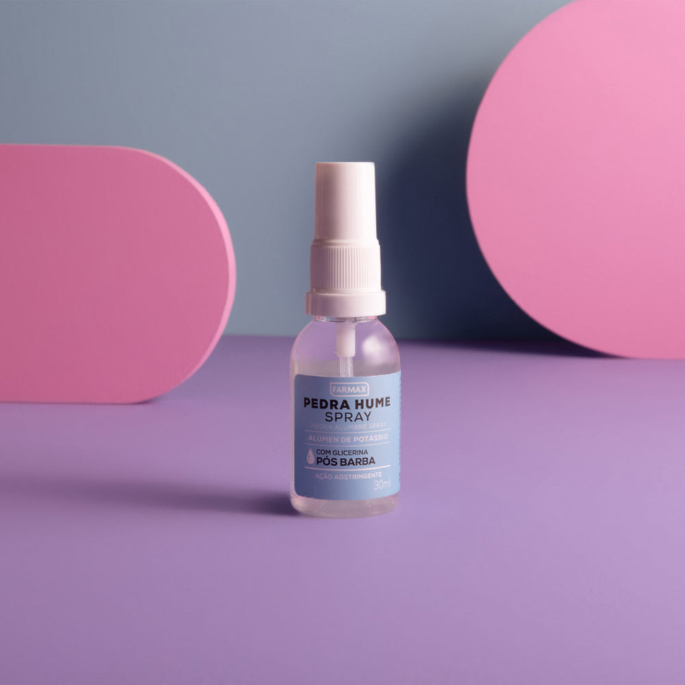 PEDRA HUME COM GLICERINA FARMAX SPRAY A Pedra Hume Spray Farmax é um adstringente que ajuda no fechamento dos poros. Eficaz para estancar cortes de cutículas e ao barbear. Modo de usar: Pulverize o sp