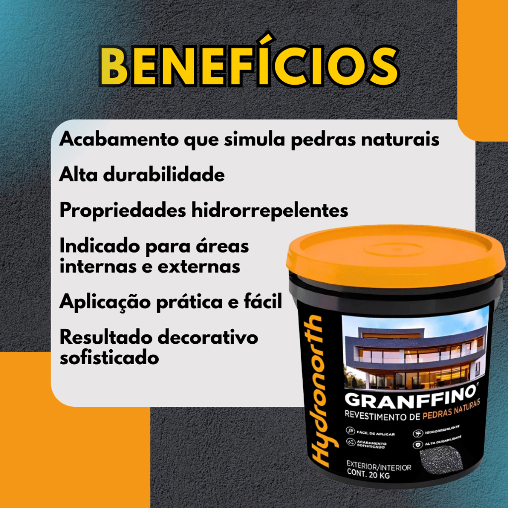 Granffino Revestimento Pedra Natural – Balde 20kg ⚠️ ATENÇÃO AO ENVIO Compre apenas 1 unidade por pedido O limite de envio permitido é 30kg por pacote, por isso não é possível enviar 2 ou mais unidades no mesmo pedido. Se precisar de mais unidades, realize compras separadas. ✨ SOBRE O PRODUTO O Granffino Revestimento de Pedras Naturais é um revestimento decorativo de alto padrão que reproduz o efeito sofisticado das pedras naturais, proporcionando um acabamento moderno e elegante. Possui alta durabilidade e propriedades hidrorrepelentes, ajudando a proteger a superfície contra umidade e garantindo excelente desempenho em ambientes internos e externos. Ideal para quem busca beleza, resistência e valorização do ambiente. 🪨 BENEFÍCIOS ✨ Acabamento que simula pedras naturais nobres ✨ Alta resistência e durabilidade ✨ Propriedade hidrorrepelente ✨ Ideal para áreas internas e externas ✨ Aplicação prática e resultado profissional ✨ Acabamento decorativo moderno e sofisticado 📦 ESPECIFICAÇÕES Produto: Granffino Revestimento Pedra Natural Embalagem: Balde 20kg Demãos recomendadas: 1 demão Diluição: Produto pronto para uso Caso necessário, diluir com até 3% de água potável 📏 RENDIMENTO APROXIMADO Balde 20kg: Rende aproximadamente 4m² a 6m² de superfície acabada (O rendimento pode variar conforme o preparo da superfície e técnica de aplicação.) 🧱 SUPERFÍCIES INDICADAS Pode ser aplicado em: • Alvenaria • Reboco • Concreto • Fibrocimento / Placa cimentícia • Massa acrílica • Massa corrida Para outras superfícies, recomenda-se consultar o departamento técnico. 🛠️ FERRAMENTAS DE APLICAÇÃO • Desempenadeira de aço inox ou acrílica • Espátula ⏱️ TEMPO DE SECAGEM • Ao toque: aproximadamente 2 horas • Secagem final: 72 horas • Cura total: 30 dias 💬 Atendimento rápido para tirar dúvidas 🚚 Envio seguro e bem embalado