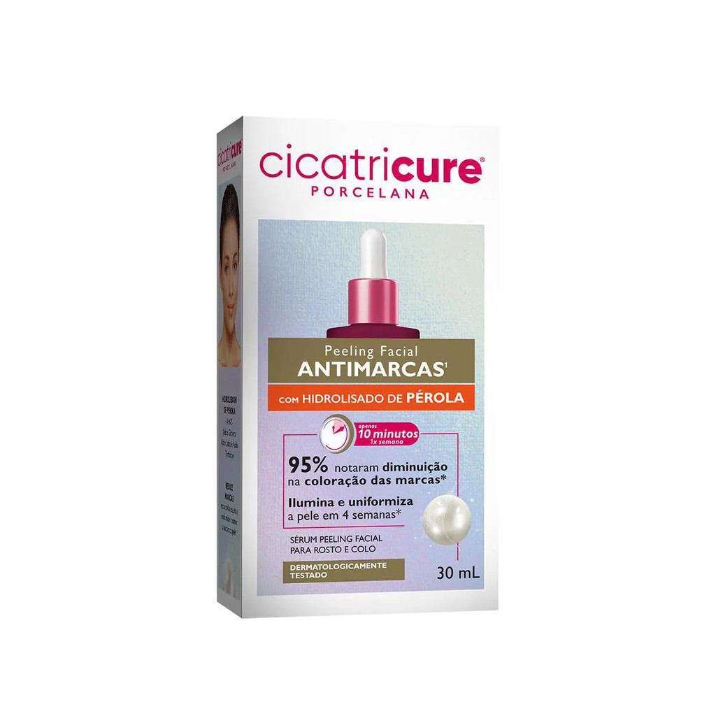 Indicado para uso no rosto, colo e pescoço, o Cicatricure Porcelana é um sérum peeling facial com ação antimarcas formulado com hidrolisado de pérola que ajuda a reduzir marcas escurecidas a uniformizar o tom e a textura da pele. Eficácia comprovada - Reduz marcas em 4 semanas - Uniformiza a pele - hidratação imediata - Pele radiante e luminosa - Não comedogênico Modo de Uso Com a pele limpa, aplique uma quantidade adequada no rosto, pescoço e colo, evitando o contato com os olhos. Deixe agir por no máximo 10 minutos. Enxágue com água em abundância. Não utilize o produto mais de uma vez por semana. Advertências Não aplique sobre a pele lesionada ou irritada. Caso haja qualquer efeito indesejado, suspenda o uso. Não aplique nas pálpebras nos cantos externos do nariz e da boca. Evite a exposição ao sol durante o uso (é aconselhado o uso de protetor solar). Uma leve sensação de ardor, pinicação ou ressecamento da pele poderá ser observada nas primeiras aplicações. Não use em crianças. Não use na gravidez e durante a lactação.