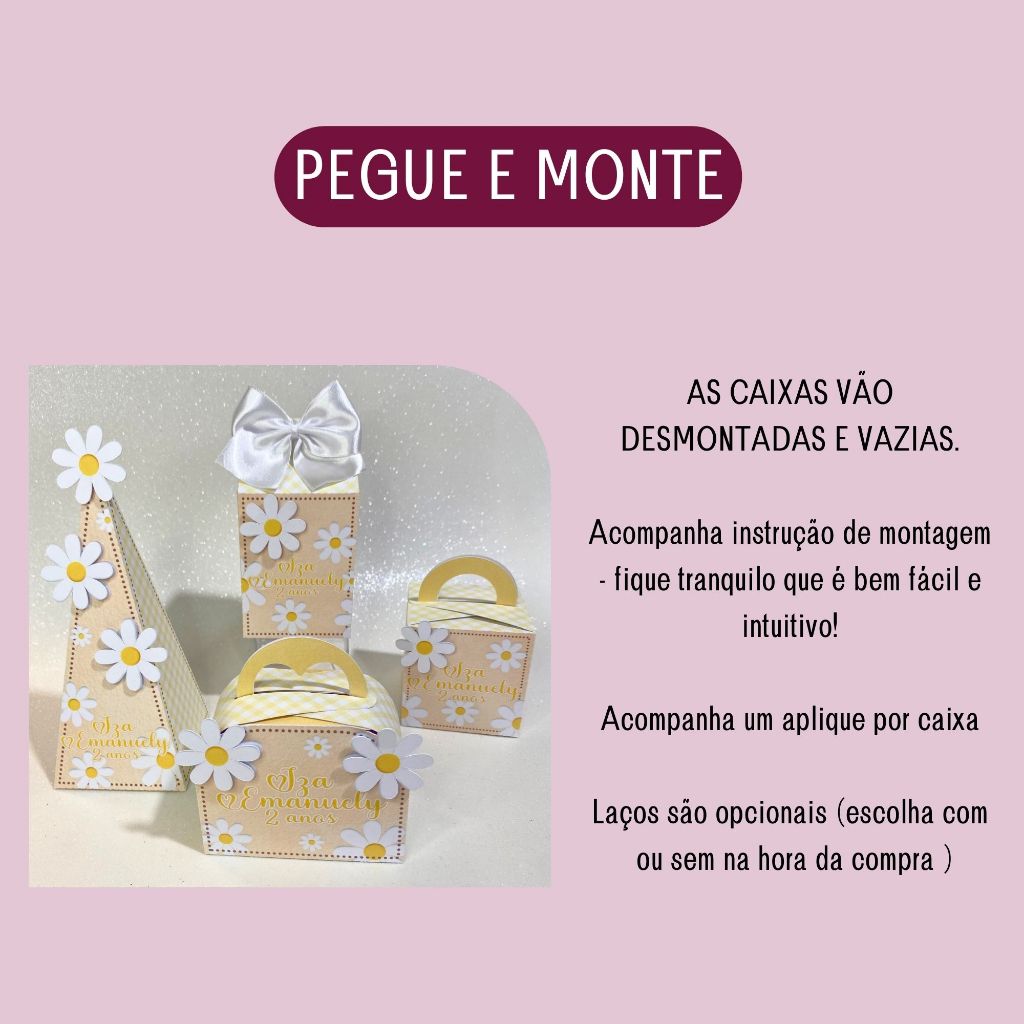 ***Informações importantes do KIT PEGUE E MONTE*** Nosso kit vai com as caixas já cortadas e vincadas, prontas para você montar em casa com cola branca, cola pano ou silicone. As fotos servem como referência — na opção pegue e monte, não acompanham pérolas, pompons, strass, relevos ou outros itens decorativos. ***FAZEMOS EM QUALQUER TEMA*** nos envie o seu via chat! Modelos inclusos no kit: - Caixa Milk – 12x6x6cm - Caixa Pirâmide – 17x7x7cm - Caixa Maleta – 9x9x4cm - Caixa Quadradinha – 9x6,5x6,5cm Cada caixa acompanha um aplique temático simples para destacar ainda mais sua festa! Papel Offset 240g (fosco), firme e resistente Impressão de alta qualidade com cores vivas Corte eletrônico preciso para um acabamento perfeito Personalizamos com nome e idade (informe no chat após a compra).Caso não envie em até 24h, enviaremos sem personalização. A arte será igual à do anúncio, alterando apenas nome e idade. NÃO alteramos o design e não enviamos arte para aprovação. ***Temos duas opções de montagem*** - Com laço, pronto para amarrar e/ou colar - Sem laço, ideal para quem já tem ou quer montar à parte Acompanha instrução de montagem simples e intuitiva. As caixas vão vazias e desmontadas. Os laços e acabamentos seguem a cor da imagem, podendo ser substituídos em caso de falta no fornecedor por opções que combinem com o tema. Caso queira outra cor nos envie no chat para verificarmos a disponibilidade. Pequenas variações de cores podem ocorrer conforme o seu celular ou computador. DÚVIDAS? Fale com a gente pelo chat. Vamos adorar te ajudar a deixar sua festa ainda mais linda!