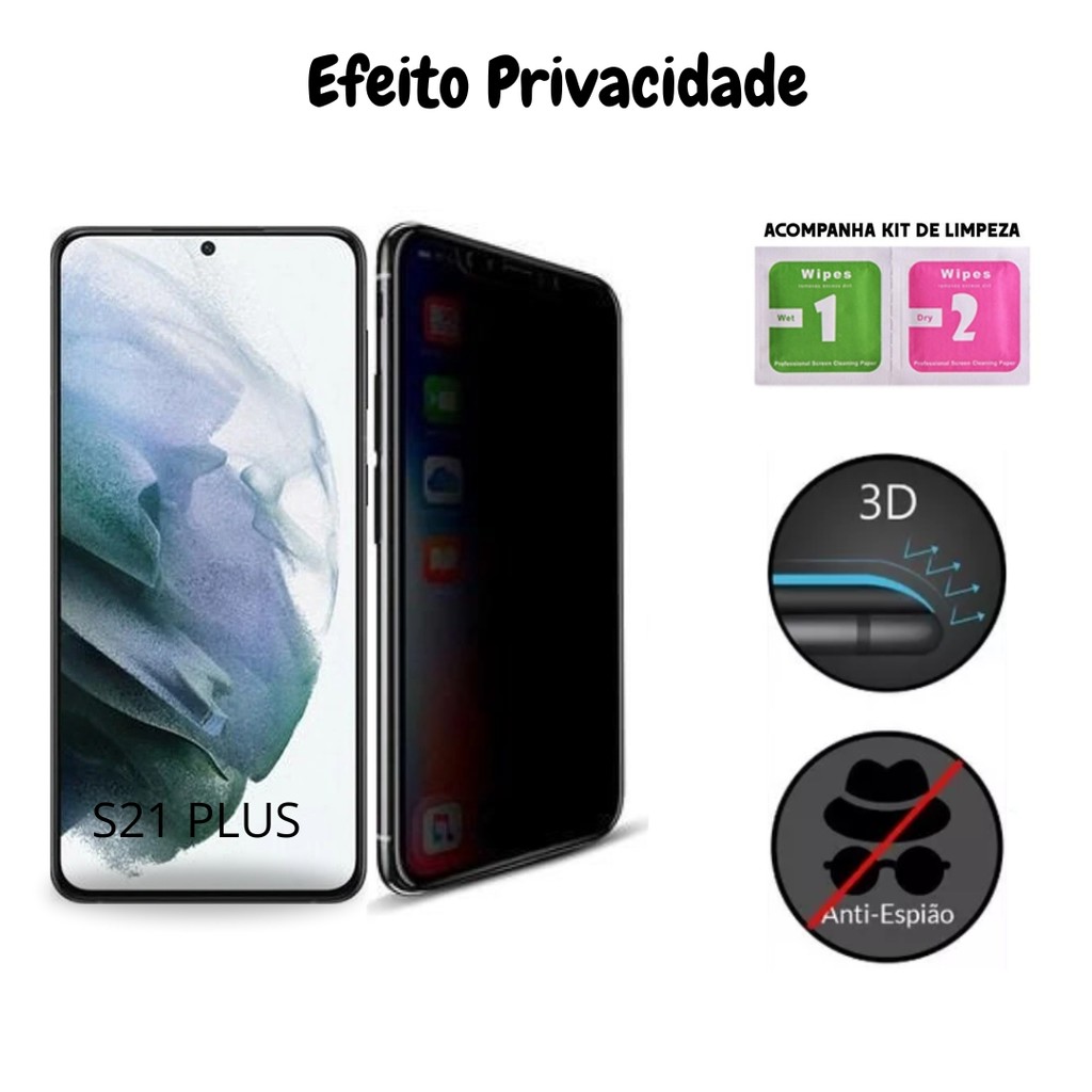 **** BEM VINDO/A Calu Multimarcas *** - Envio imediato produto despachado rapidamente! - Nós GARANTIMOS a melhor qualidade do mercado (Produtos testados)! - Todos os produtos são enviados com nota fiscal! - Iremos atende-lo da melhor forma! E vamos acompanhar seu pedido até que o receba! ;) Embalamos todos os pedidos com todo cuidado necessário para não danificar o produto durante a entrega. SUA PELÍCULA CHEGA PERFEITA. Somos uma loja especialista em atacado e distribuição de acessórios, compre com segurança e praticidade!!! Conteúdo da Embalagem: - 01 Película 3d Privacidade Para Samsung Galaxy S21 Plus - 01 Kit limpeza para aplicação ------------------------------------------------------------------------------------------ - Ultra proteção contra quedas, impactos e arranhões - Protege 100% a tela Frontal do aparelho - O contorno é protegido por uma camada de Polietileno laminado (Alta resistência ao Impacto) - Design extremamente Moderno - Fina e Leve (Não interfere no peso do aparelho) - Ultra transparente oferecendo 99% de nitidez - Compacta (Tamanho exato do aparelho) - Preserva a estética e durabilidade do seu celular - Não interfere na utilização de capinhas