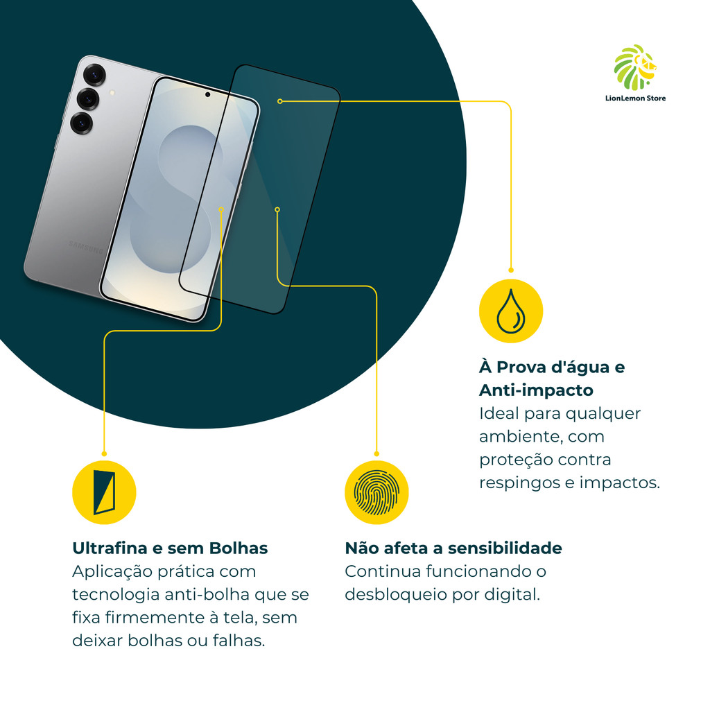 Proteção para o seu celular com a película de vidro temperado Premium da LionLemon Store! Nossa película de vidro temperado possui a tecnologia 3D que simula a parte frontal da tela do smartphone, se adaptando perfeitamente às curvas, ao design e às cores das laterais do celular. Essa tecnologia torna a película praticamente invisível, além de possuir um tamanho ideal para o uso com capinha de proteção. Ela possui alta transparência HD e proporciona uma experiência de toque extremamente suave. Com aderência rápida e dureza de superfície 9H+ evita que a tela estoure facilmente. Compatível com o Samsung S25 Plus. Acompanha kit de lenços + Adesivos guia e removedor de partículas + Espátula de aplicação. --------------------------------------------------------------------------------------------------------------------------------------------------------- Diferenciais do Produto: - Cobertura Total: extremamente resistente, oferece uma cobertura completa que acompanha as curvas das bordas laterais. - Anti-impacto: a proteção de superfície 9H+ garante resistência contra arranhões e impactos, preservando a integridade da sua tela. - Alta transparência: transmissão de luz de até 100% - HD: possui tecnologia HD que proporciona imagens mais nítidas, cores vibrantes e um toque suave. Como se você estivesse interagindo com a tela sem a película. - Toque delicado. - Anti-riscos.