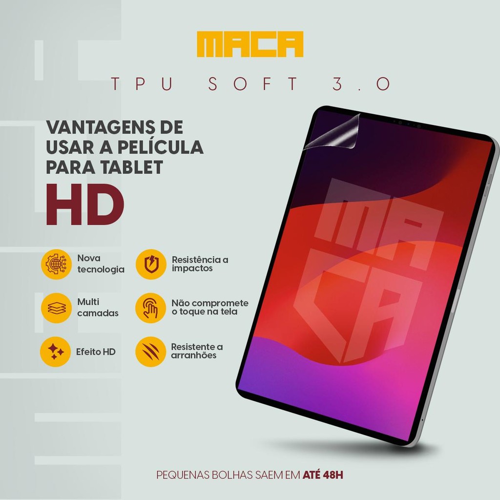 Películas MACA Tablet Nova Tecnologia TPU Soft 3.0 | Alta Resistência As Películas MACA foram criadas com alta tecnologia para proteger e melhorar sua experiência visual. Estão disponíveis em duas versões: Fosca Tipo Paperlike e Transparente Clear HD, oferecendo proteção completa e acabamento profissional. Versão Fosca Tipo Paperlike – Sensação de papel -Textura especial que imita papel, ideal para escrita, desenho ou anotações com stylus. -Reduz reflexos e brilho, garantindo leitura confortável em ambientes iluminados. -Maior controle e precisão nos movimentos. -Proteção contra riscos, sujeira e impactos. Versão Clear HD – Transparência e nitidez total -Totalmente transparente: mantém as cores e brilho da tela original. Design invisível após aplicação. Brilho da tela preservado. -Alta sensibilidade ao toque: ideal para jogos e digitação. Tecnologia de Hidrogel Premium -Material flexível que se adapta à tela e às bordas. -Efeito autorregenerativo: riscos e bolhas desaparecem com o tempo. -Aplicação sem bolhas: nanopartículas ativadas pelo uso diário. Atenção: Se usar capinha, recomendamos a versão reduzida (2 mm menor). Solicite via chat após a compra. Full não tem alteração para versão capinha. Conteúdo da Embalagem: 1x Película MACA (Fosca ou Transparente) 1x Kit de aplicação (flanela, adesivo, cartão e lenço com álcool) Garanta já a sua! Adicione ao carrinho e escolha sua versão. Estoque limitado!