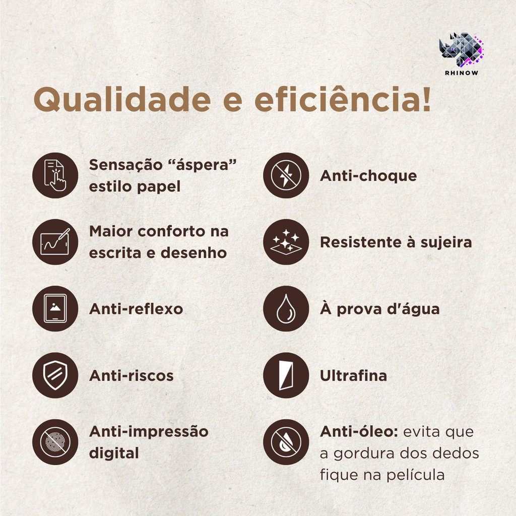 Transforme seu tablet em uma verdadeira tela de criação! A película de cerâmica Paper Touch da Rhinow foi desenvolvida para oferecer a experiência mais natural possível ao desenhar, escrever e navegar no seu tablet. Com tecnologia de cerâmica premium, ela garante uma sensação de papel autêntica ao toque da caneta, sem comprometer a nitidez da tela e a fluidez dos movimentos. Sua blindagem inteligente oferece proteção avançada contra impactos, riscos e arranhões, sem afetar a sensibilidade do toque. Além disso, seu acabamento anti-impressão digital e anti-reflexo mantém a tela limpa e confortável para uso em qualquer ambiente. Se o rinoceronte aprovou, você também vai adorar! Compatível com Samsung Galaxy Tab S10 Lite (tela 10,9"). Conteúdo da embalagem: 1 película + kit de lenços para limpeza + espátula para aplicação da película + adesivo removedor de sujeira -------------------------------------------------------- Benefícios Rhinow: Sensação de papel: toque suave e textura levemente áspera para maior conforto na escrita e no desenho Blindagem Inteligente: alta resistência contra impactos e riscos sem comprometer a sensibilidade do toque Cobertura Total 3D: se ajusta perfeitamente à tela, acompanhando as bordas laterais para uma proteção completa Ultrafina e leve: proteção sem adicionar volume, mantendo o design original do aparelho Anti-reflexo: reduz o brilho para melhor visibilidade em qualquer iluminação e auxilia na fotofobia Anti-óleo e Anti-impressão digital: tela sempre limpa, sem marcas de dedos
