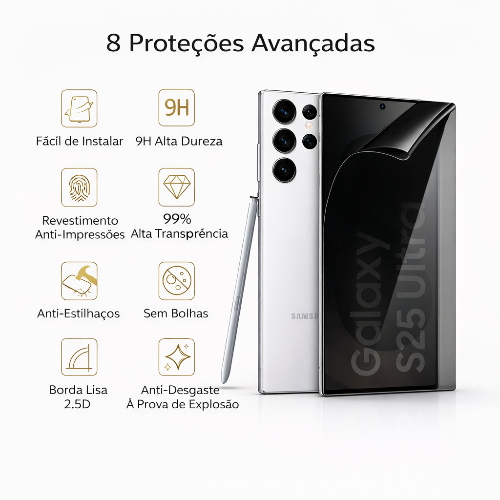 Película Privacidade 3D de Vidro Funciona Digital sem Furo Samsung S25 S25Plus S25Ultra S24 S23 S22 S22Plus