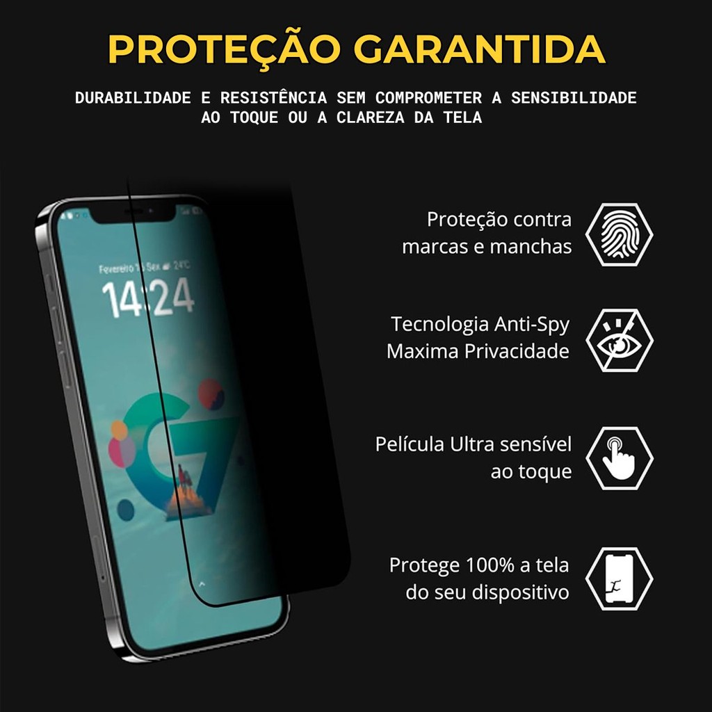 Película de Cerâmica Privacidade Fosca para iPhone - Proteção e Estilo Garanta a proteção e a privacidade do seu iPhone com esta película de cerâmica de alta qualidade. Desenvolvida para oferecer segurança e funcionalidade, ela combina inovação e praticidade em um único produto. Principais Benefícios:Proteção Superior: Fabricada com nano cerâmica de última geração, essa película oferece uma defesa imbatível contra arranhões, riscos e danos à tela do seu dispositivo.Privacidade Garantida: Com tecnologia de privacidade, a película reduz a visibilidade da tela em ângulos laterais, garantindo que apenas você possa visualizar as informações. Ótima para ambientes públicos ou quando você não quer que olhares curiosos vejam o que está na sua tela.Acabamento Anti-Reflexo: O design fosco elimina reflexos indesejados, proporcionando uma visualização mais confortável em qualquer situação, seja sob luz forte ou ao ar livre.Resistente a Impressões Digitais: A camada de nano cerâmica evita marcas de dedos, mantendo sua tela limpa e com aparência impecável o tempo todo.