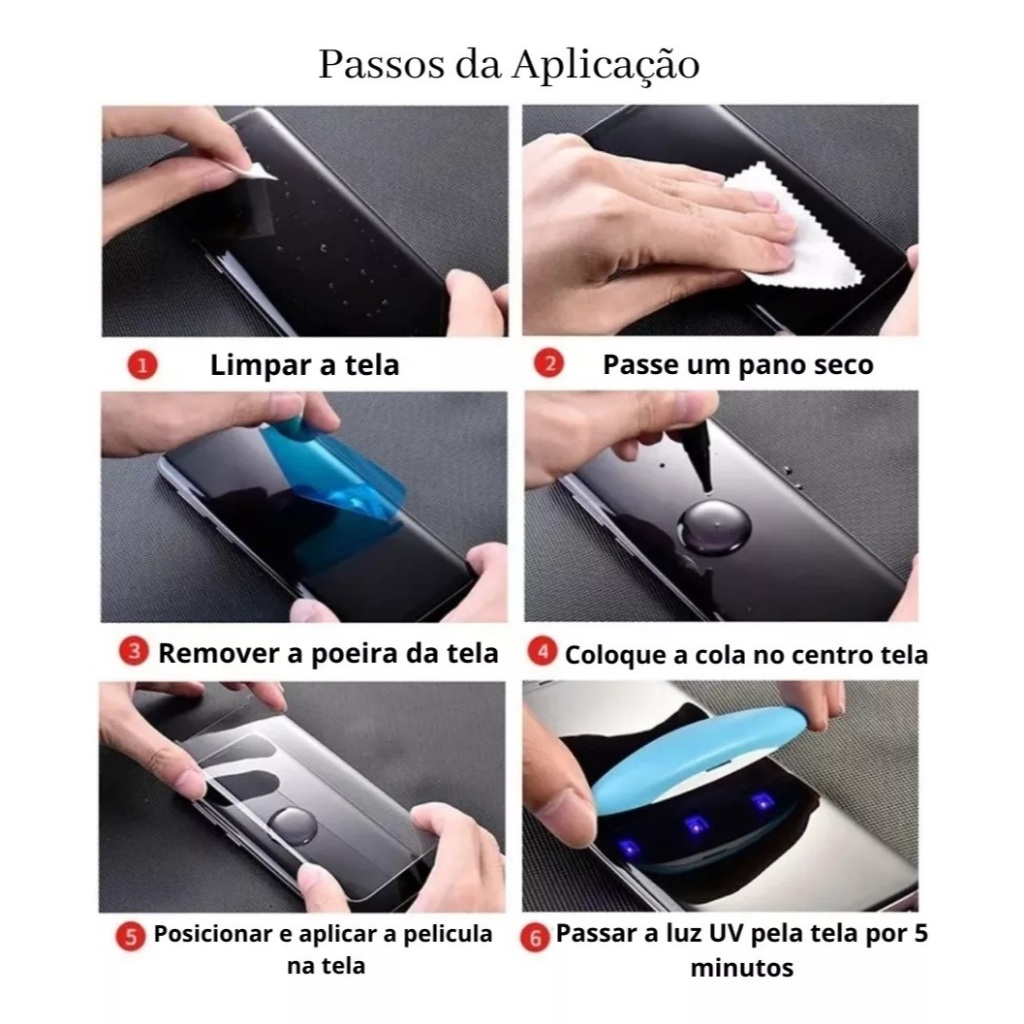 Película UV Curvada Compatível com Samsung Galaxy S20/S20 Plus S20 Plus S10/S10 Plus S9/S8 S8/S9 Plus S10E Note20 🔹 Película de Vidro Temperado UV Curvada – Proteção Premium para sua Tela 🔹 Proteja a tela do seu celular com uma película de alta qualidade, cuidadosamente projetada para oferecer máxima segurança sem comprometer o visual ou a sensibilidade do toque. ✨ Características do Produto: ✔️ Vidro Temperado com Tecnologia UV – Alta resistência contra impactos, trincas e quebras.. ✔️ Bordas Curvadas – Encaixe perfeito e cobertura total da tela, inclusive nas extremidades.. ✔️ Alta Transparência – Imagens nítidas e cores reais, sem distorções. ✔️ Toque Suave e Sensível – Preserva a fluidez da tela original. ✔️ Fácil de Aplicar – Acompanha adesivo UV e não forma bolhas. 💎 Benefícios: ✅ Protege contra impactos, riscos, manchas e sujeira ✅ Design discreto e elegante. ✅ Durabilidade prolongada ✅ Compatível com a maioria das capas... Película de Vidro temperado UV Curvada nas bordas Ótima Qualidade e cuidadosamente projetado para dar maior proteção a tela do seu celular Auxilia contra impactos protegendo a tela do celular ,proteção contra riscos, manchas e sujeiras. ✔️ Nível de Dureza: 9H. ✔️Vidro Temperado Slim: 0.33mm. ✔️ Reflexo. ✔️Alta definição. ✔️Fixação por cola líquida com secamento com lâmpada UV. -Sua instalação é muito fácil -Remoção da película e fácil ✨INFORMÇAÕ PARA APLICAÇÃO: 1. Para aplicação correta, antes de tirar a película protetora, coloque a película de vidro no aparelho e veja como deverá ficar. 2. Limpe o display com o lenço umedecido que acompanha, seque com outro lenço. Certifique-se que não tenha nenhum pelo ou poeira antes de aplicar. 3. Corte a ponta do recipiente com cola líquida, espalhe a cola somente no meio do display verticalmente como no vídeo, gire o verso da ampola, isso fará com que o liquido saia mais facilmente, só para precaução, deve ser colado o adesivo no fone para evitar que entre cola, a cola vai escorrer somente pelos laterais normalmente. 4. Retire o plástico da película, centralize e alinhe em seu celular, solte-a na tela. Não deve pressionar. Certifique que a película de vidro está bem centralizada, se aplicada torto, pode dar erro no sensor ultrassônico, além de perder sensibilidade 5. Caso ela não fique totalmente alinhada, não levante ou retire a película, apenas ajuste ela com as mãos. 6. Utilize a flanela para retirar o excesso de cola que ficou nas bordas do celular. 7. Ligue a luz UV, direcione a luz para a tela do seu celular, mantenha próxima, cerca de 1cm, permaneça por aproximadamente 30 segundos em cada parte da película. O tempo total com a luz para secagem é de 5 minutos. ✔️RECOMENDAÇÃO: Coloque um durex nas áreas abertas do telefone, para que a cola não escorra nessas áreas. CONTEÚDO DA EMBALAGEM: ✔️1 Película de Vidro ✔️1 Cola líquida ✔️1 Lâmpada UV ✔️1 Kit Limpeza 💥ATENÇÃO💥 OS APARELHOS QUE POSSUEM IMPRESSÃO DIGITAL NA TELA PODEM NÃO ADERIR SENSIBILIDADE PARA O FUNCIONAMENTO NORMAL DA IMPRESSÃO. OBS: As películas de vidro normal podem não cobrir totalmente até o fim das bordas da tela, isto se deve ao fato do aparelho possuir a tela curva ou para o melhor encaixe da capinha. 📦 Envio rápido e bem embalado para evitar danos durante o transporte! 💥 Ideal para quem deseja manter a tela do celular intacta e com aparência de nova por muito mais tempo! ✅CASO NÃO SINTA SEGURANÇA AO APLICAR A PELÍCULA DEVERÁ PROCURAR UM PROFISSIONAL ESPECIALIZADO, POIS NÃO NOS RESPONSABILIZAMOS CASO OCORRA ALGUM DANO OU BOLHA APÓS A APLICAÇÃO. PELICULA NÃO ACOMPANHA APARELHO!