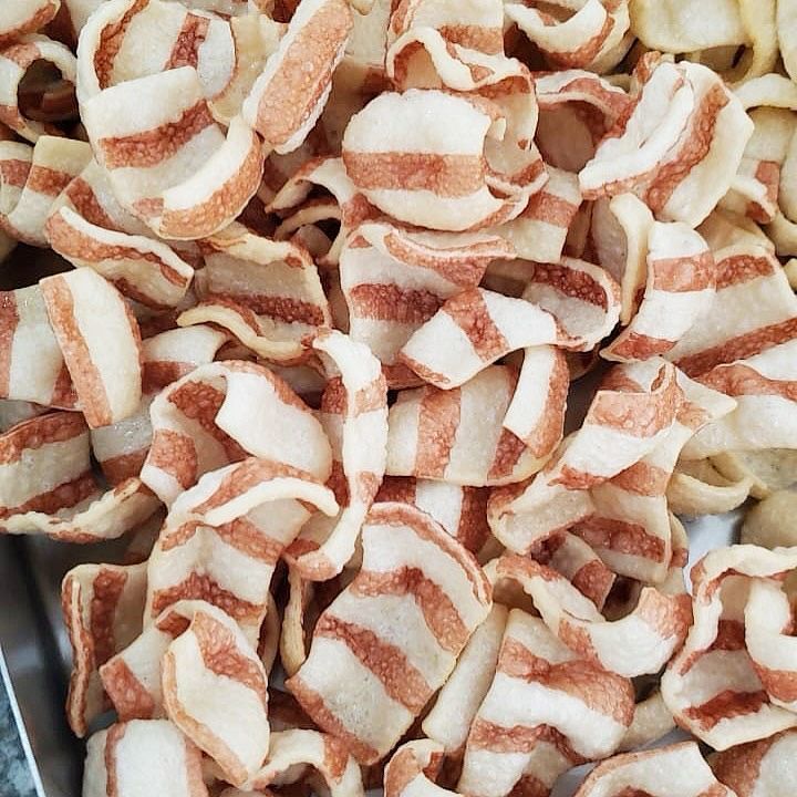 PELLETS DE TRIGO LISTRADA PURURUCA 1KG PARA FRITAR SNACKS FESTAS TAMANHO 20X50MM Descrição: Pellet à base de farinha de trigo listrada; Pacote COM 500G OU 1KG Muito conhecida com Pururuca, Pelinha ou Bacon; Isso vai depender da sua região! Sabor de infância! Super deliciosa e muito prática de se fazer!! Em uma panela com Óleo, você deve colocar suas pellets em temperatura variando de 190°C +/- 5°C; Tempo de Fritura : 5 à 15 segundos; Depois é só temperar com Sal a gosto. VALIDADE DE 6 MESES