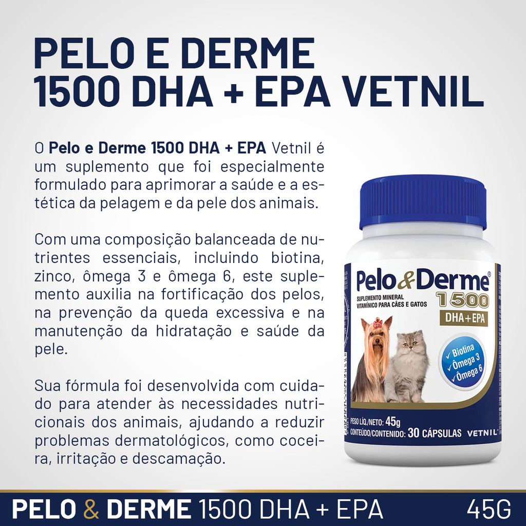 A nossa loja está a mais de 10 anos no mercado, com produtos originais e com nota fiscal. ____________________________________________________________________________ Melhore a Saúde da Pele e Pelagem do Seu Pet com Pelo e Derme 1500 DHA + EPA Vetnil! O Pelo e Derme 1500 DHA + EPA Vetnil é um suplemento vitamínico premium desenvolvido para cães e gatos, ideal para promover a vitalidade e o brilho da pelagem, além de manter a pele saudável e protegida. BENEFÍCIOS COMPROVADOS: - Rico em ômega 3 e ômega 6, essenciais para a nutrição da pele e a redução de inflamações; - Contém biotina e zinco, que ajudam no fortalecimento dos pelos e previnem quedas excessivas; - Fórmula especial para hidratar a pele e combater problemas dermatológicos, como coceira e irritações. MODO DE USAR: - Para cães e gatos entre 10 e 20 kg: 1 cápsula ao dia. - Para pets com mais de 20 kg: 2 cápsulas ao dia. - Pode ser administrado diretamente na boca, misturado aos alimentos, ou com o conteúdo dissolvido e fornecido com uma seringa. Garanta já a vitalidade do seu pet com a nutrição que ele merece! ____________________________________________________________________________ Gostou? Não perca tempo, garanta já o seu!