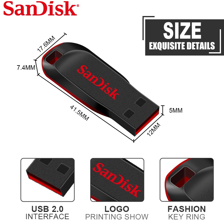 Modelo: Cruzer Blade Cor: Preto Capacidade: 8GB 16GB 32GB 64GB Interface: USB Especificação USB::2.0 Compatível Com: Android, iOS, iPhone, Laptop, Mac, Vault de Memória, PC Original:Não Vendores estão usando aritmética de memória Flash decimal: 1 MB = 1000KB, 1G = 1000 MB Sistema calculado, operacional com aritmético binário: 1 MB = 1024KB, 1 GB = 1024 MB; Por isso há algumas diferenças entre capacidade de exibição e capacidade nominal de produtos de memória flash. Conteúdo da Embalagem: 1 x Pendrive Lâmina Sandisk Cruze