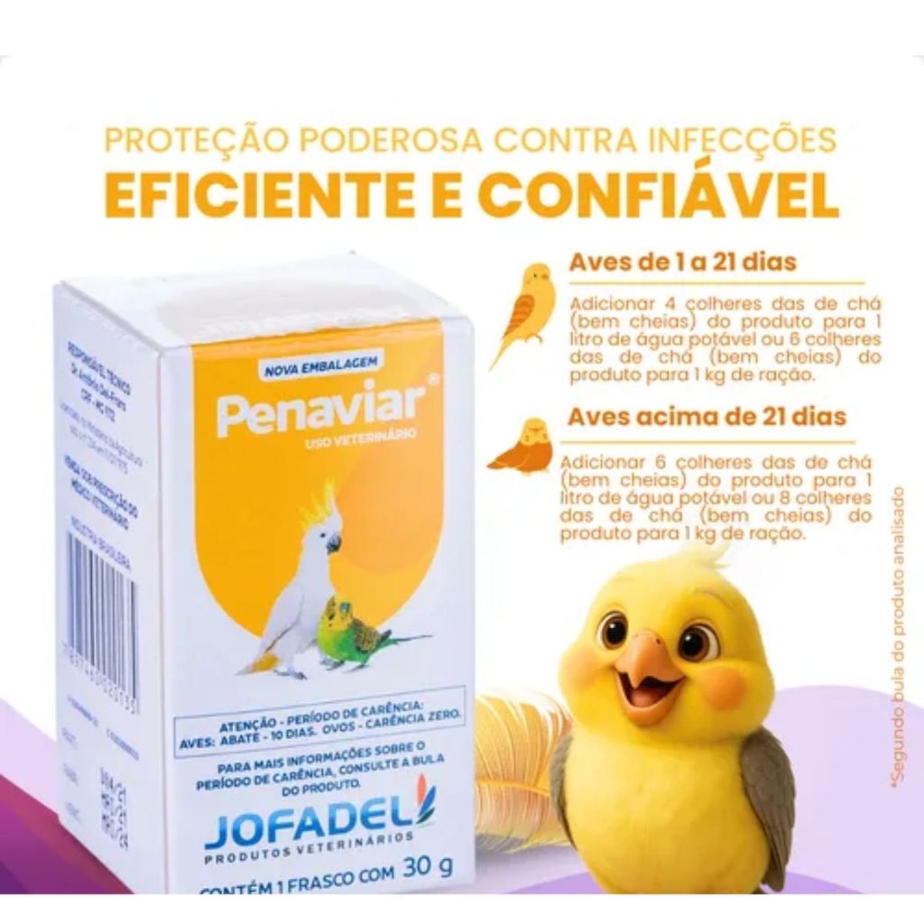 DESCRIÇÃO: Penaviar 30G Penaviar é um produto para pássaros e aves, indicado para infecções intestinais, cólera aviária, coriza, germes e diarréias em pássaros. Em termos técnicos, é indicado para o tratamento das infecções entéricas das aves e suas manifestações, causadas por germes sensíveis à sulfaguanidina e à sulfadiazina sódica: estreptococos, estafilococos, Escherichia coli, shigelas, clostrídios, protozoários, vibrião colérico, coccidios e ricketisias. Atua como medicação auxiliar nas diarreias inespecíficas, síndromes desinteriformes das aves, cólera aviária, coriza e infecções intestinais como medicação profilática. FÓRMULA: Cada 100 g do produto contém: Sulfaguanidina - 2,10 g Sulfadiazina sódica - 3,00 g Enxofre em pó - 25,00 g Azul de metileno - 0,01 g Excipiente q.s.p. - 100,00 g OBEDECER AOS SEGUINTES PERÍODOS DE CARÊNCIA AVES: Para aves de abate, o abate de animais tratados deve ser realizado somente após 10 dias a ultima aplicação. OVOS: não é necessário período de carência para o consumo de ovos de aves que foram tratadas. Entretanto, a má utilização do produto (diferente das indicadas na bula) pode causar a presença de resíduos de produto acima dos limites seguros, tornando o alimento de origem animal impróprio para o consumo. APRESENTAÇÃO: frasco de 30 g. ATENÇÃO: Antes de utilizar qualquer medicamento veterinário sempre leia as instruções que acompanham o produto (bula ou rótulo). Informações sujeitas a divergências entre rótulo ou bula e este contéudo. Caso haja diferença entre as informações aqui apresentadas e rótulo ou bula, prevalecerá sempre a informação do rótulo ou bula que acompanha o produto. Sempre leia a bula antes de utilizá-lo. Consulte sempre um médico veterinário! ------------------------------------------------------------------------------------------------------------------ A MANADA ANIMAL é um marketplace de produtos veterinários. É a escolha certa para tutores que prezam pela qualidade dos produtos que seu animal necessita. Tudo com o suporte de uma equipe de veterinários e gestores com mais de 10 anos de experiência no mercado. Fique tranquilo, todos os nossos produtos são originais, adquiridos através de distribuidores credenciados! Ah, e todas as vendas acompanham nota fiscal! MANADA ANIMAL, Tranquilidade pra você, cuidado para ele!