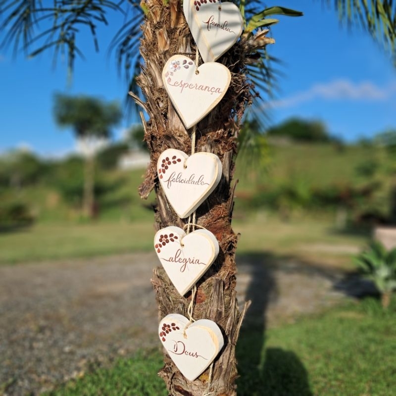 Penca compostA por 5 Corações de madeira As pencas são uma tendência nas decorações. Perfeito para decorar seu lar ou presentear em uma data especial. Peça leve e delicada, ideal pra ser usada em várias ocasiões, pode ser usada em portas, maçanetas, área externa, ganchos, paredes e onde sua imaginação permitir. Acabamento: Coração: Madeira Pinos Cordão Sisal Peça 100% artesanal enpintadas à mão cada coração mede cerca de 10 cm x 1 Comprimento cerca de 50 cm